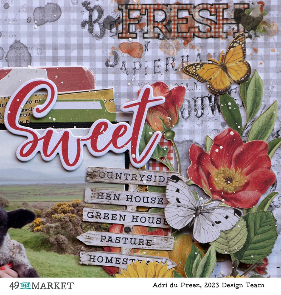 The flower clusters are made of Laser Cut wildflowers and Elements. Some of the flowers and foliage are raised with foam tape. The picket fence, basket, roosters, and signpost are from the Laser Cut Elements. The picket fence was cut in half and glued to the sides of the photo.