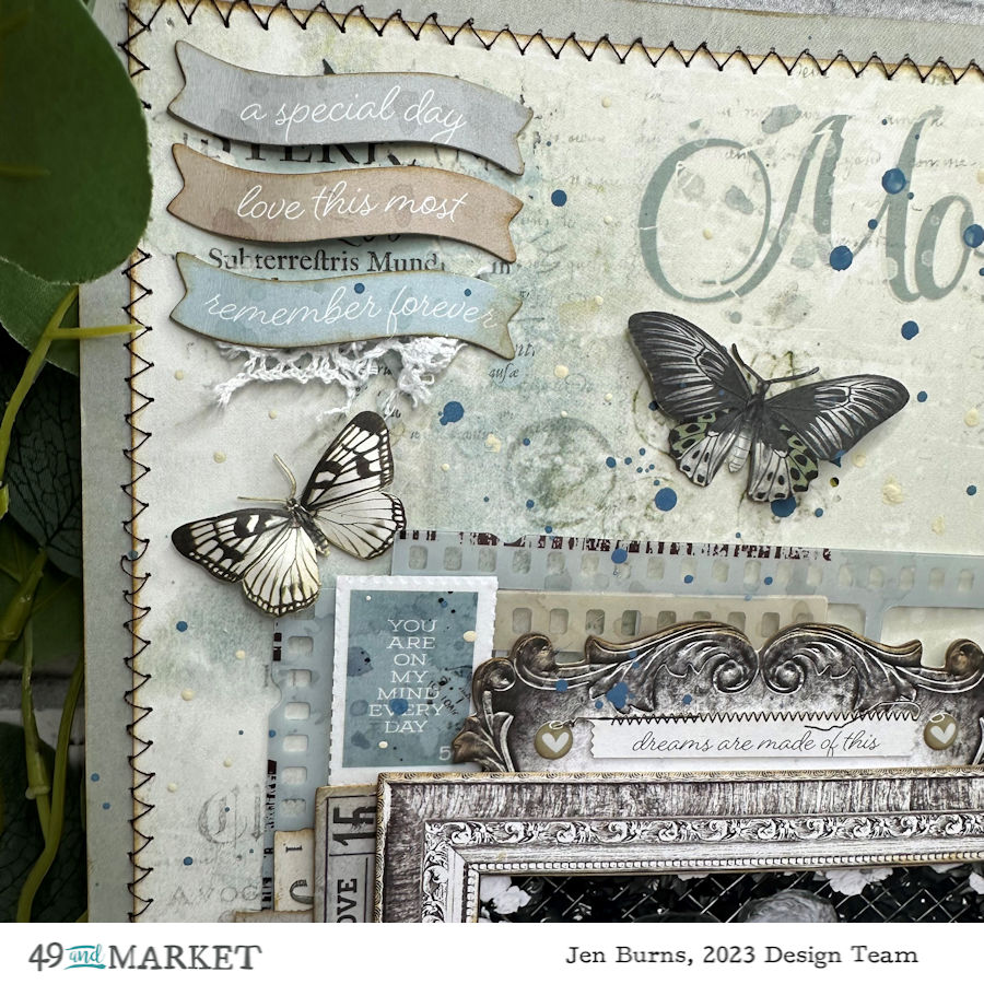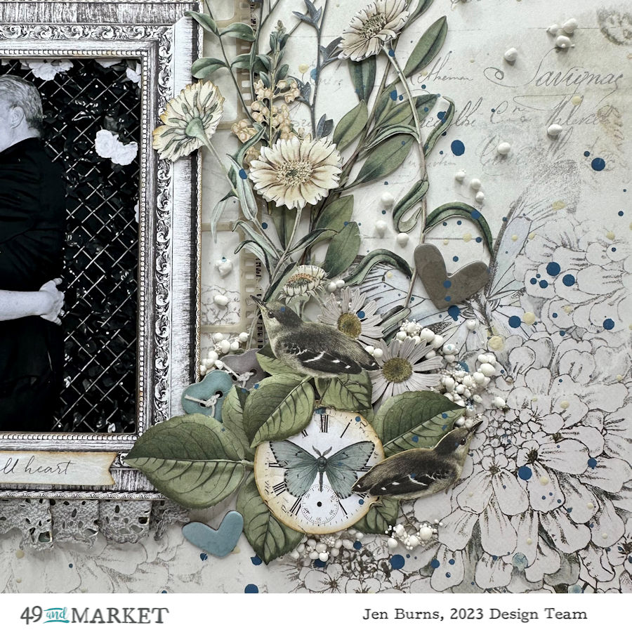 I really loved making this cluster using a frame with a wrought iron piece behind then added layers of the Wildflower laser cuts, ephemera and general laser cuts along with the title of my layout “ALL MY HEART” and the gorgeous butterfly.