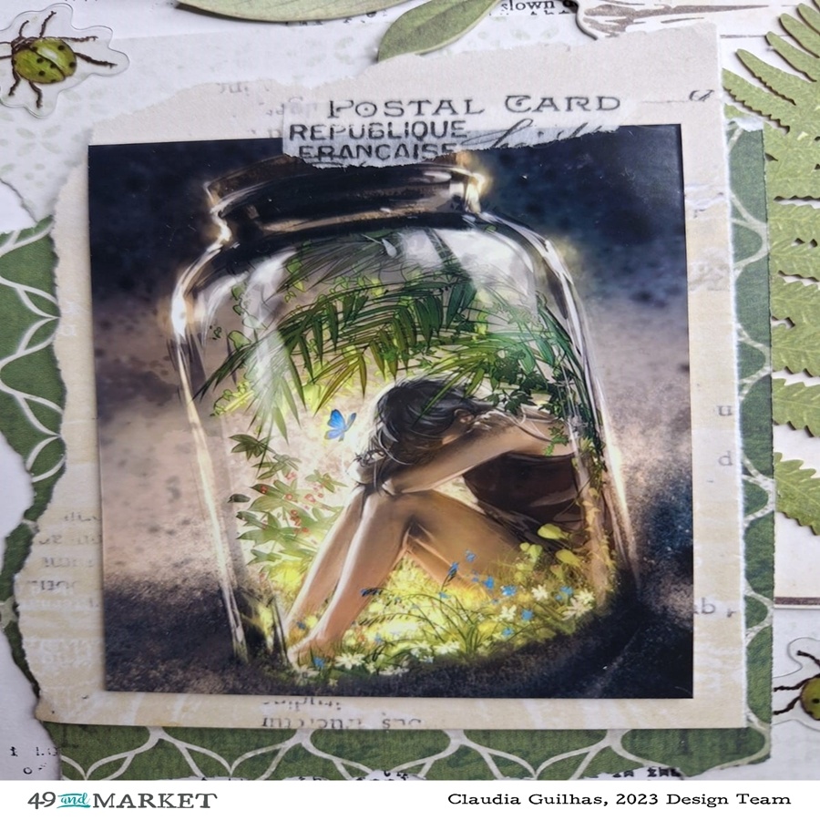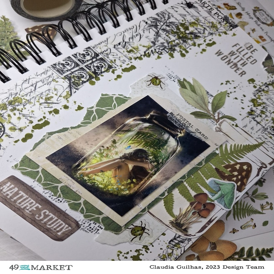 This art journal page is more than just textures and images; it’s a visual story of mystery and curiosity. The delicate foliage and mushrooms evoke a sense of wonder. It invites viewers to question the secrets nature holds and the beauty it shares.