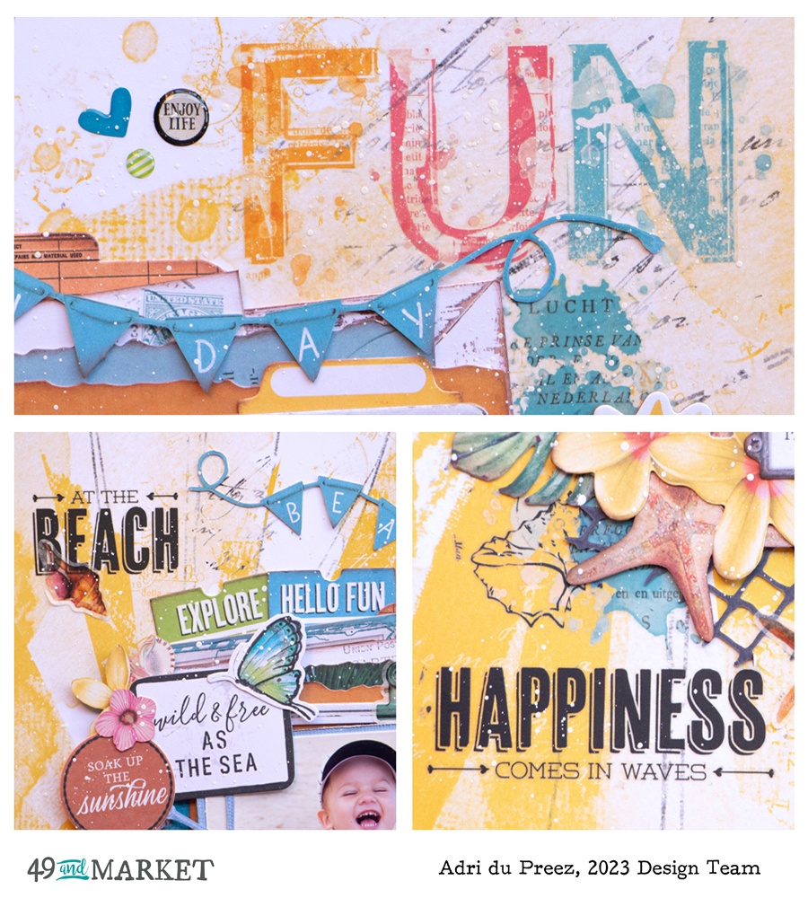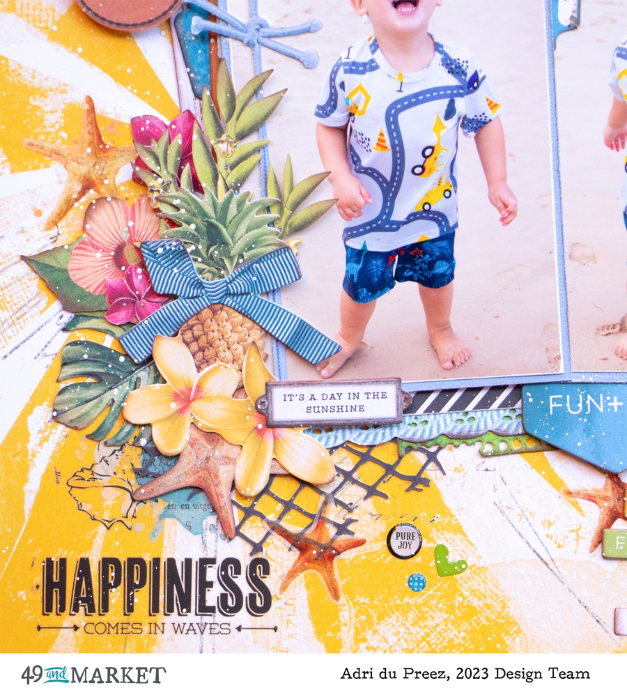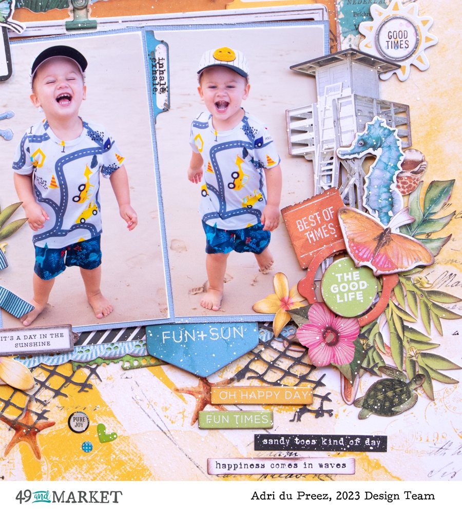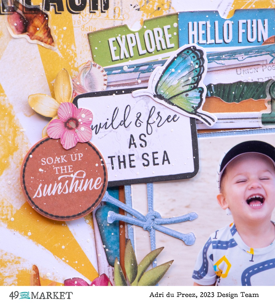 I matted the layered photos on several ephemera pieces and General Laser-cut elements as well as lace and a photo wrap from the Color Swatch Ocean Laser Cut elements, a frame from the Color Swatch Ocean Frame Set, and a Curators Essential Key Lined chipboard frame. I also used a cardstock die-cut piece from the Spectrum Sherbet Remnants that are perfect for layering. For the title of my page, I used the cute Beach Day banner included in the General Laser Cut set.