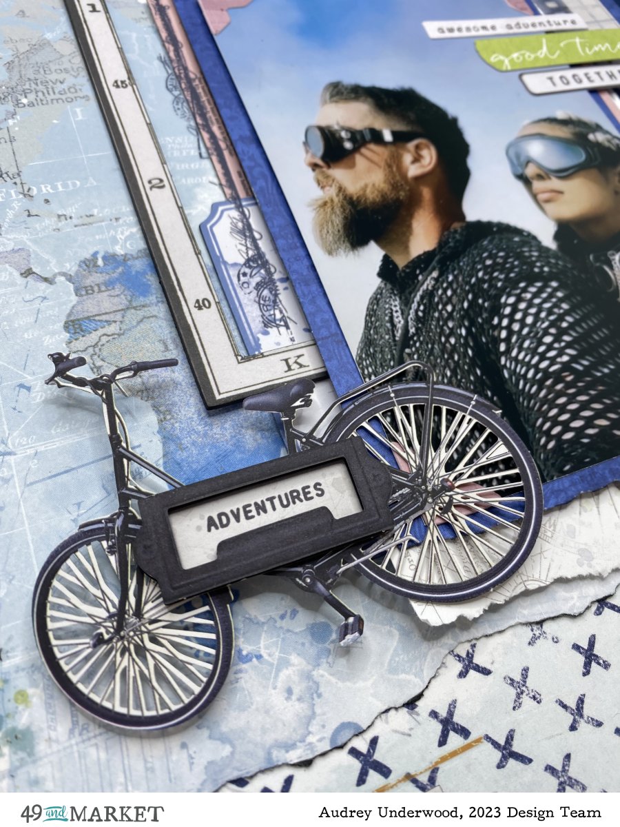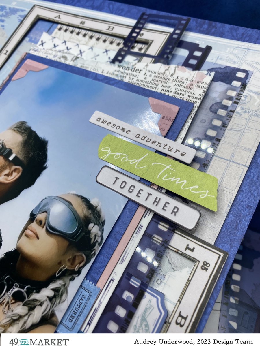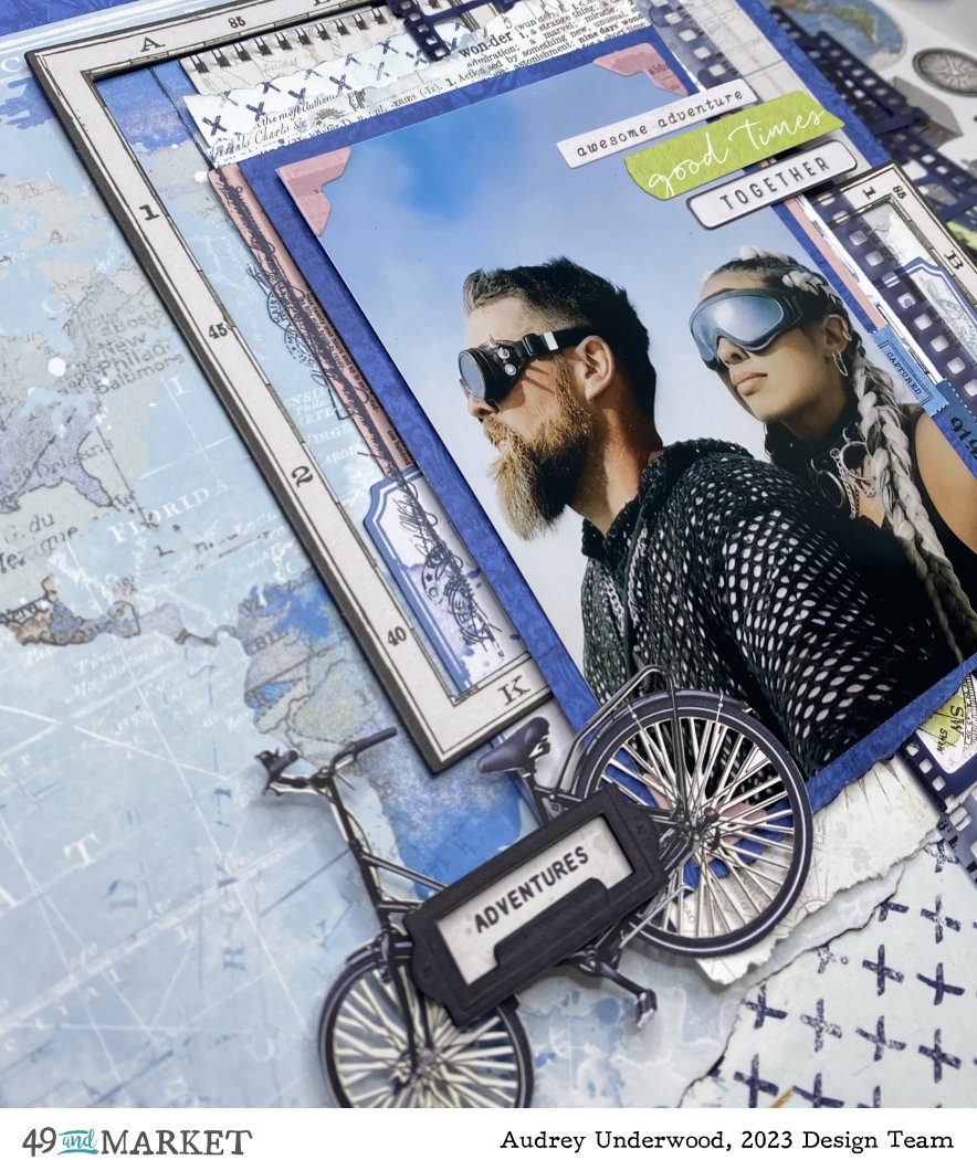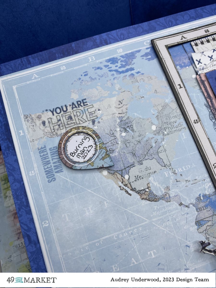 It just so happened I could pin point the location where the photo was taken on the Mapping the World paper using one of the Geo frames from the Vintage Artistry Everywhere – Chipboard Set. The photo is one of many awesome photos of my son and his wife at Burning Man 2023. I matted the photo on a blue from the Vintage Artistry Everywhere – 6×8 Collection Pack, then mounted that on a collection of other 6×8 papers. I tucked Vintage Artistry Everywhere, – Chipboard Map Frames, Acetate Filmstrips, Laser Cut Elements and Ephemera Bits behind and around the photo. There is also Colour Swatch Inkwell – Ticket Essentials tucked in there. I added a touch of pink to the layout with 6×8 paper and photo corners from the ephemera pack.