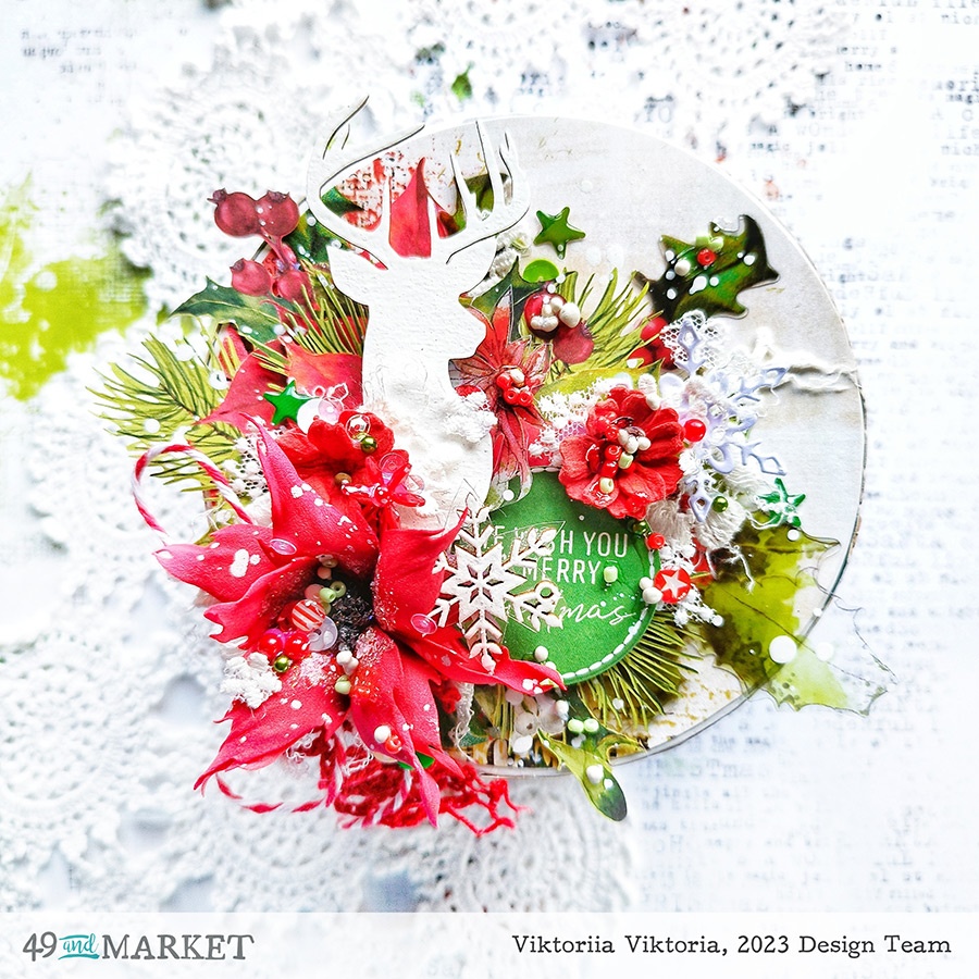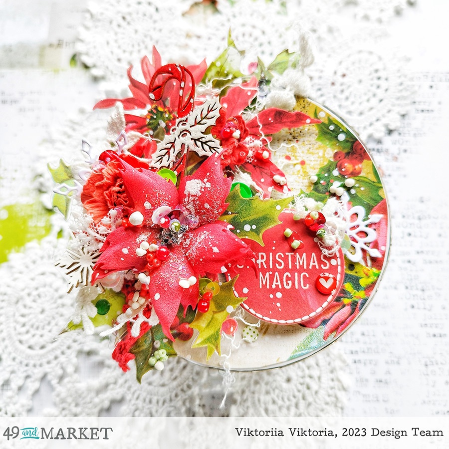 Of course, some elements from Christmas Spectacular Ephemera bits and Christmas Spectacular Ticketed Ephemera found their place. Also in the layers along with the lace I used some acetate elements from the Christmas Spectacular acetate foliage. I found the captions for my tags in Christmas Spectacular Chipboard word set.