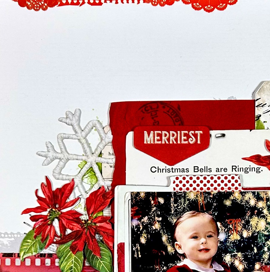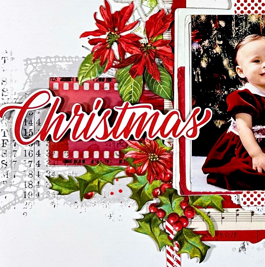 To the left of the photo, I replaced the filmstrip in the kit with one of the acetate Filmstrip Frames. The one from the kit had the word ‘Merriest’ on it, and I wanted to use the title ‘Christmas’ from the Chipboard Word Set there. I added more holly and flowers from the Greenery Laser Cut Elements under the title. Under the holly at the bottom is 1/2 of the candy stripe pole. I used the other half on the right side at the top.