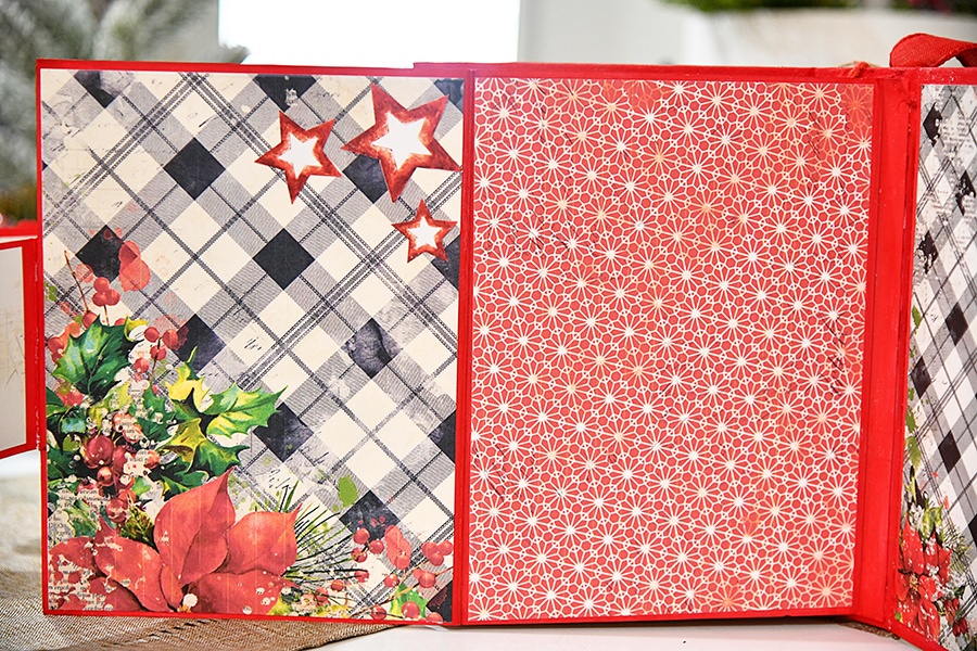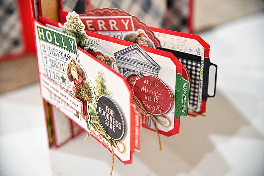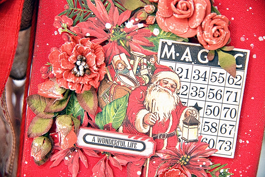 It is a little bittersweet that I share with you my last Design Team Project for 49 and Market. And what a way to end the year, then with an album created with the gorgeous Christmas Spectacular 2023. This collection, with its traditional colors is an absolute dream. I started by covering a white Foundations Album with a cream-colored linen fabric. I painted it a red acrylic paint to match the red in the collection. I started with the Christmas Spectacular Cluster Kit for the cover, and it took a life of its own when I went in a different direction. So, I just went with the flow as my creative fingers lead me. I had the ribbons for the spine in my stash, and I added some 49 and Market Single Jute. I did string some buttons from the Cluster Kit onto the jute.