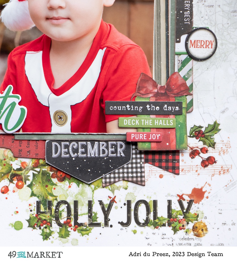 To create the cluster, I used elements from the Greenery and General Laser Cuts. Chipboard bits and words are included in this collection, and I glued a chipboard label, tab, circle shape, stars, and chipboard words to my layout. These cute Christmas lights are from the 6×8 Classis Rub-on Transfer Set.