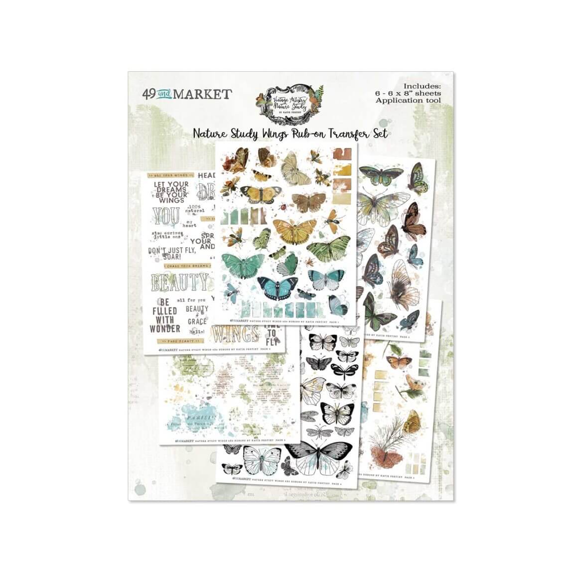 High-quality rub-on transfers. Each 6×8″ sheet is filled with various imagery to coordinate with the collection. Images include butterflies, word art, engravings, watercolor splotches and more. They can be applied to a variety of clean surfaces for a unique and beautiful effect. Imported