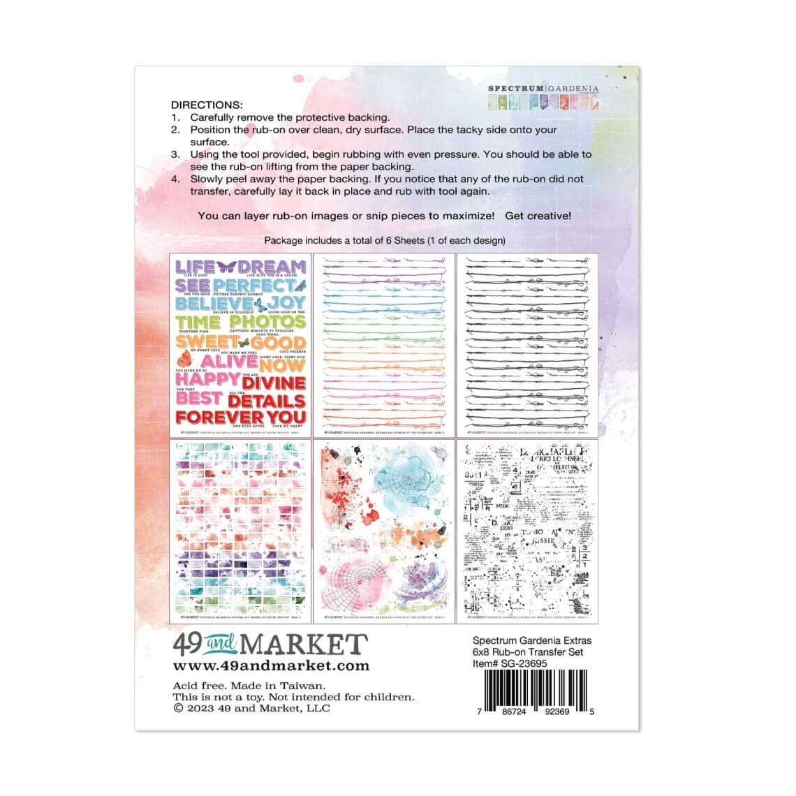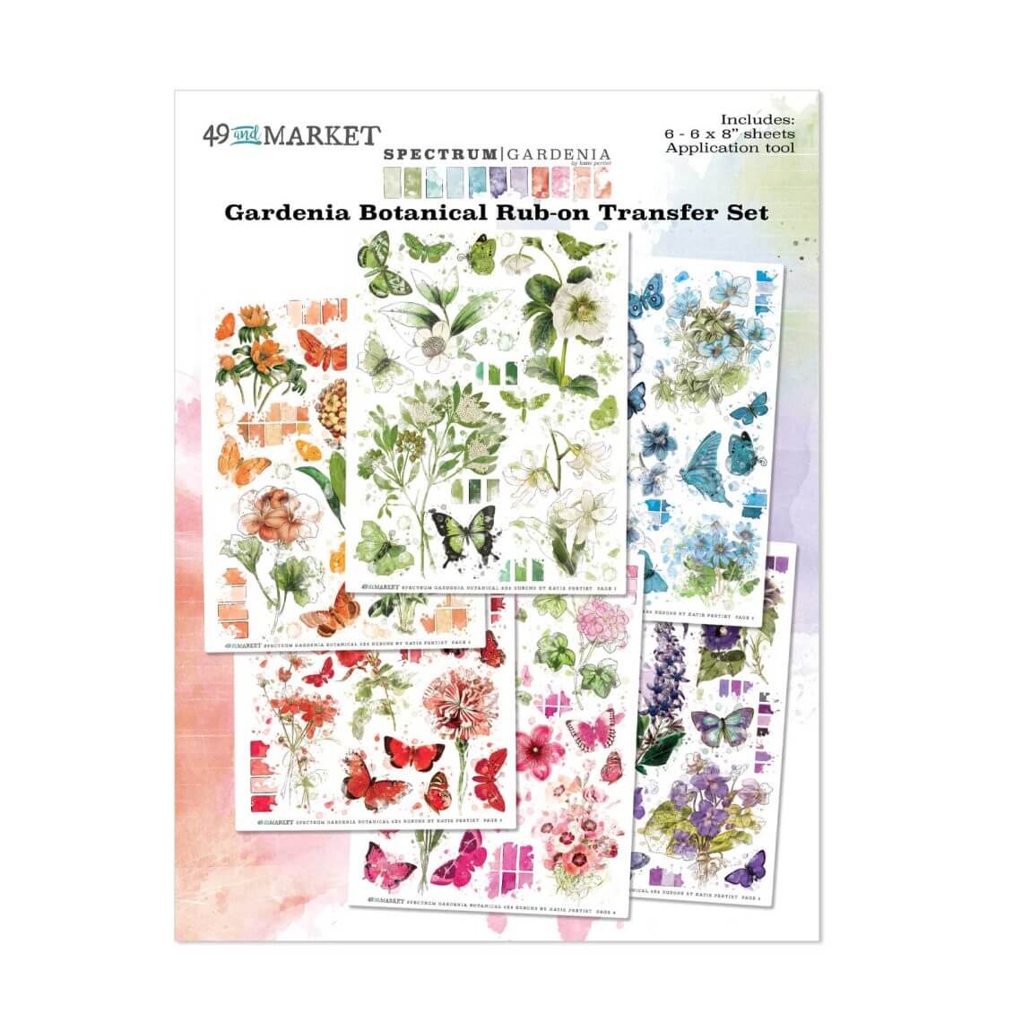 High-quality rub-on transfers. Each sheet represents a shade from the beautiful rainbow of colors from the Spectrum Gardenia collection. Sheets measures 6″x8″ and are loaded with various watercolor images of florals, butterflies, splashes and pallettes. They can be applied to a variety of clean surfaces for a unique and beautiful effect. Imported
