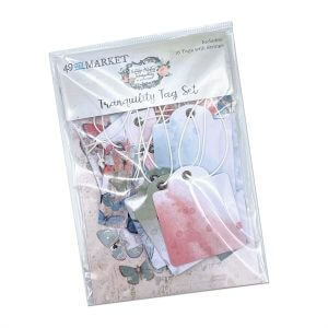 Die-cut tags with metal eyelets and strings attached. Images include tags with watercolor splashes, florals, and butterflies. Coordinates with all other pieces from the Vintage Artistry Tranquility collection. Imported
