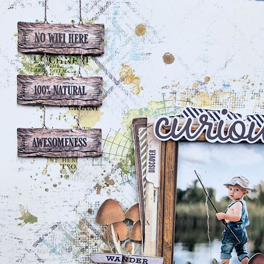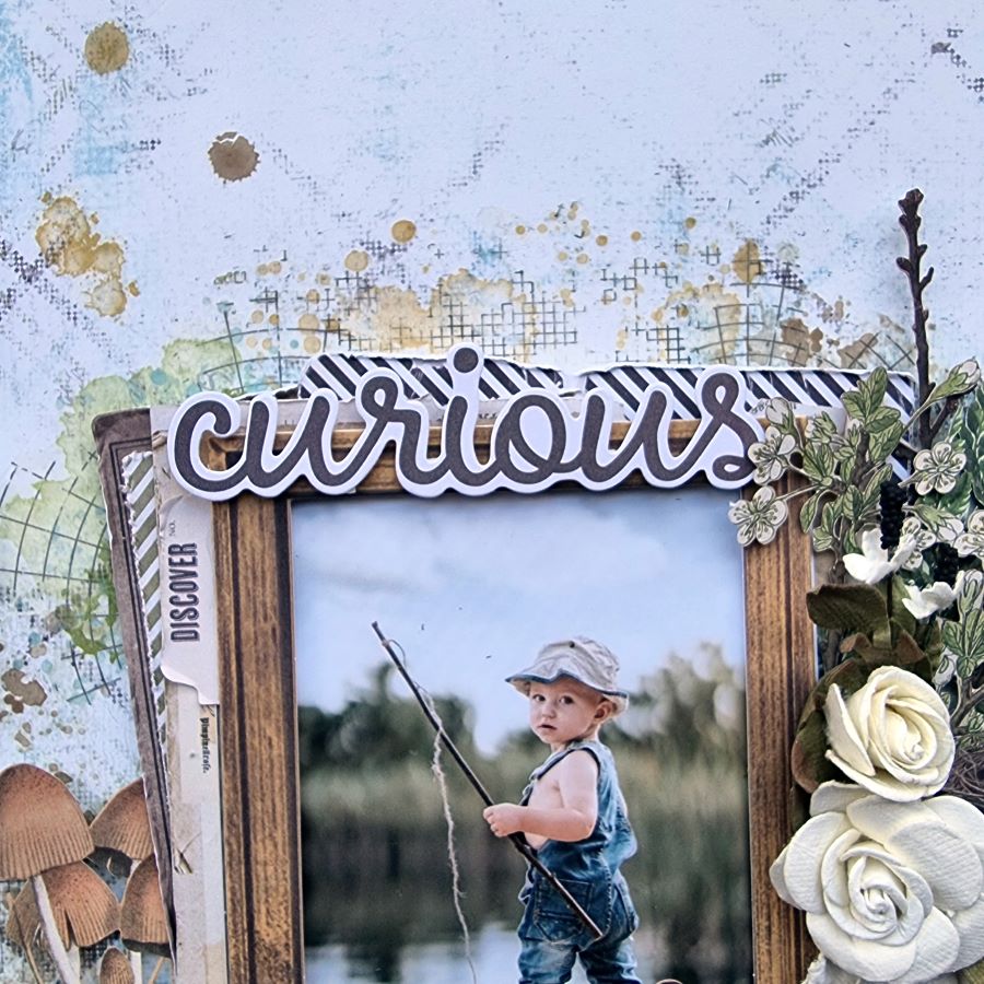 I have used various thicknesses of foam tape to create the different layers and the dimensions in the cluster. I created the signage feature – also from the general laser cut pack. I have added rub-ons first and then added the three signs on foam tape down the left side of the layout. The title “curious” has been adhered with foam tape to the top of the photo.