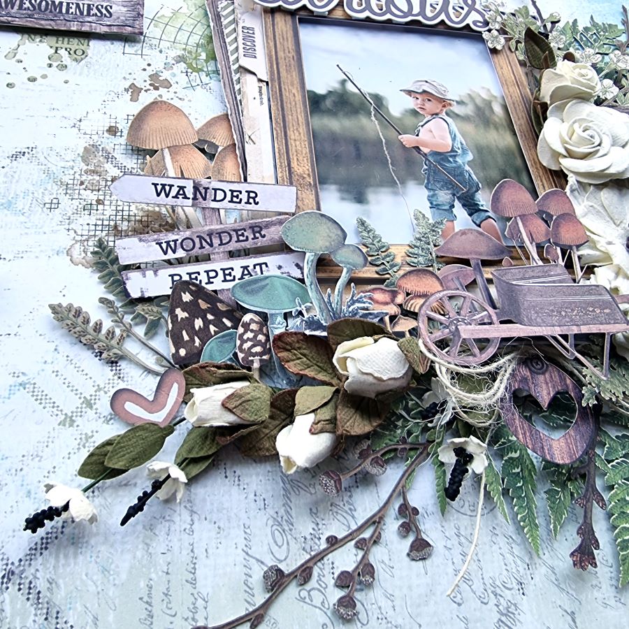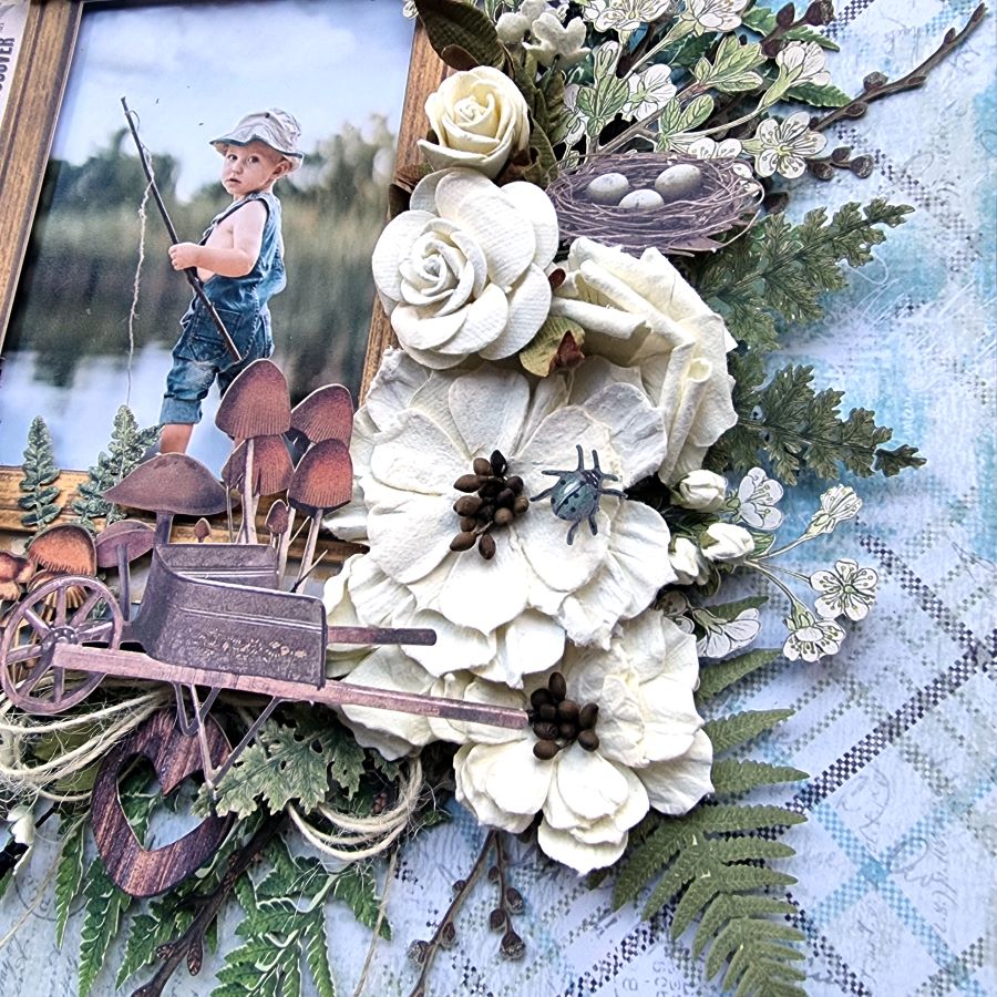 I then added some rub-on transfers around the photo frame using the 6 x 8 foliage rub-on transfers. From here, I started with the cream Nature’s Bounty flowers first, and layered this with leaves from the Mushrooms and Foliage laser cut pack.
