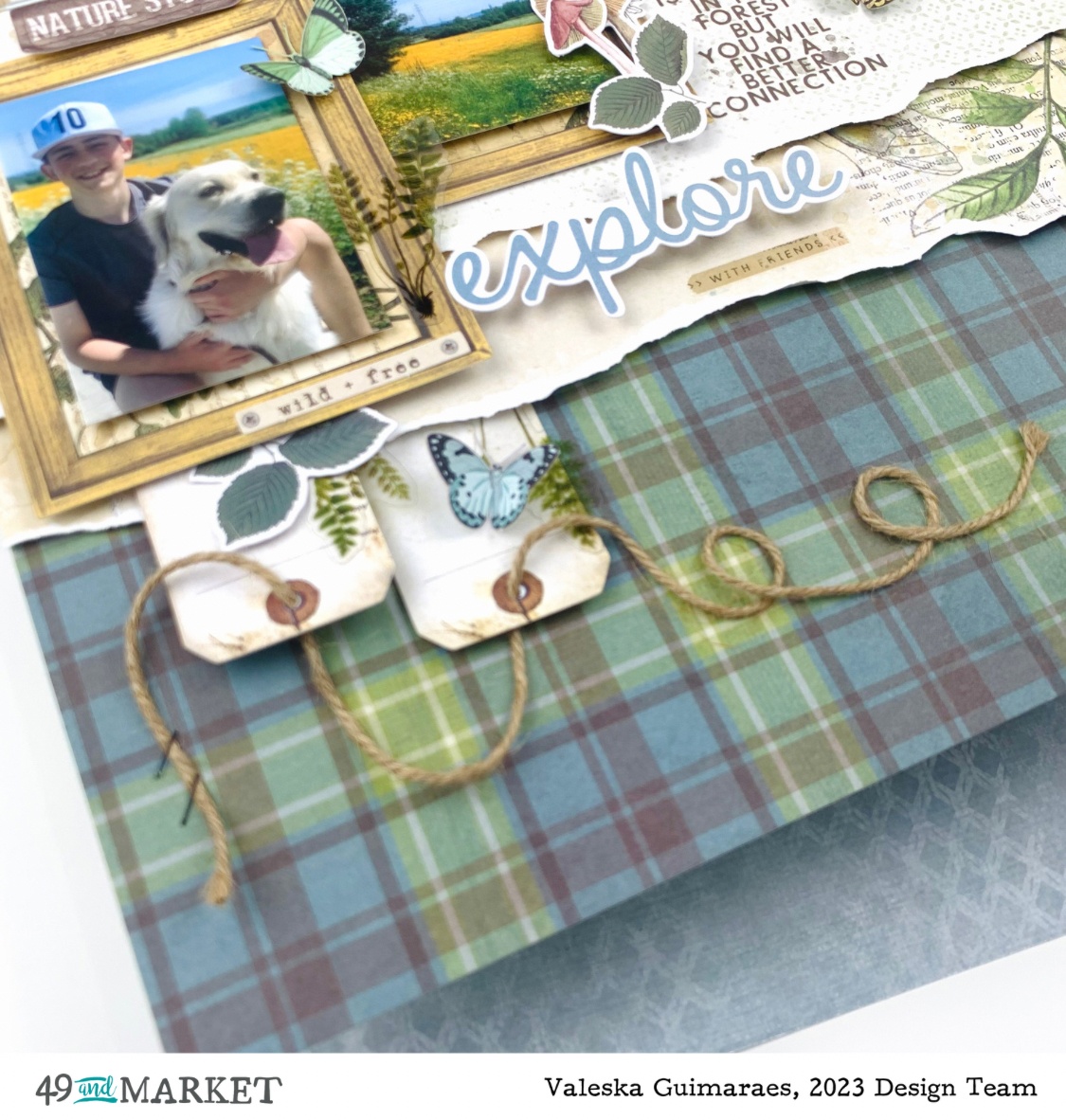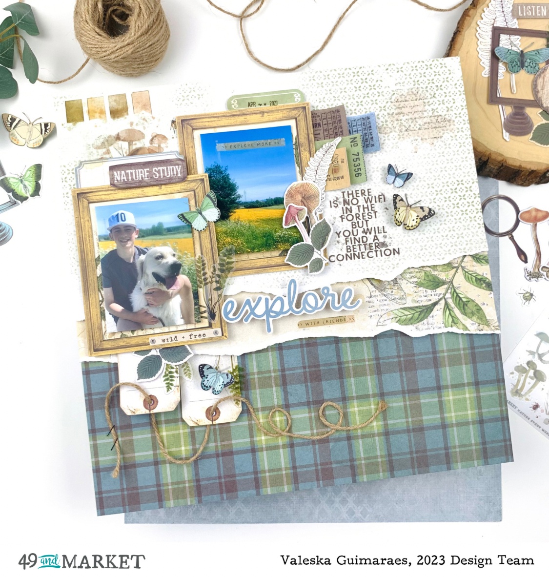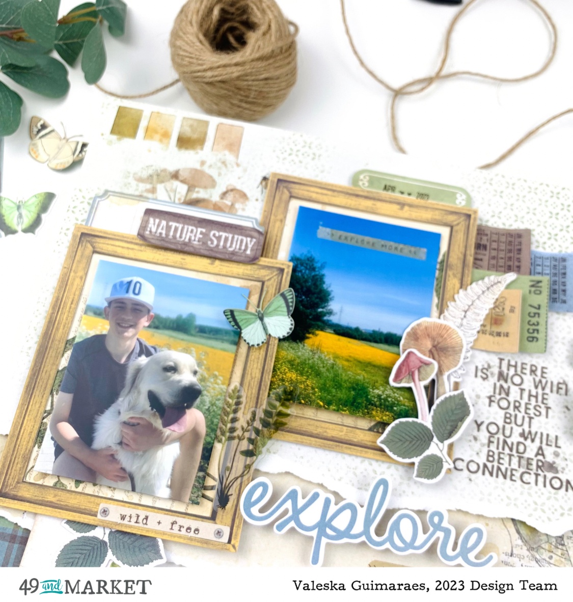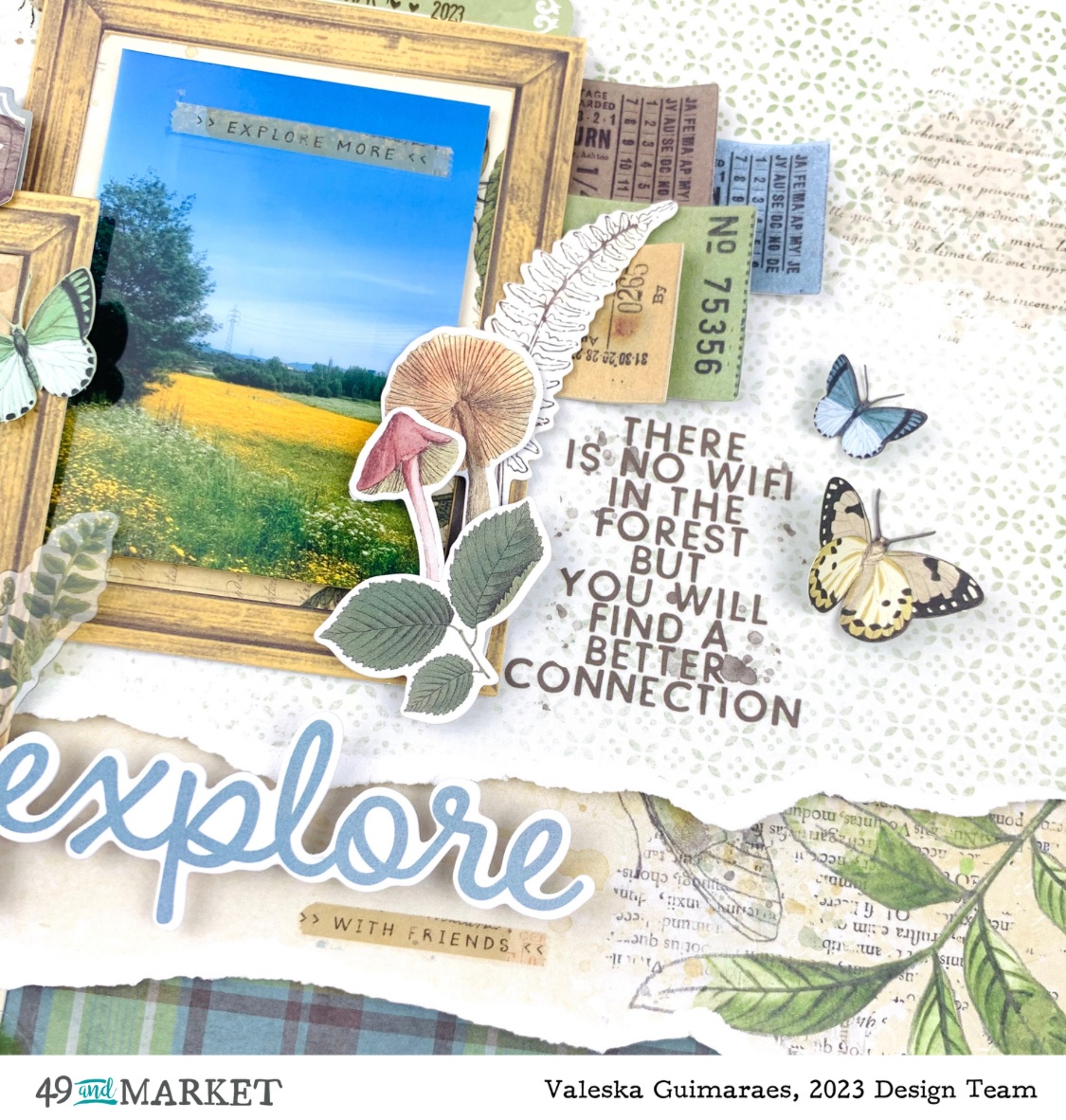 I also used green sheets from the acetate pack and loved the transparency it gave to the photos and tags. I placed mushrooms, leaves, tickets, and various other elements from the ephemera pack. To finish, some butterflies with raised wings, just glue in the middle, and the Explore title.