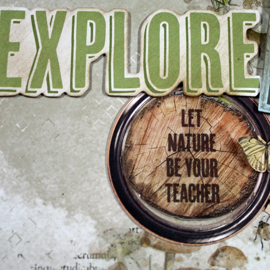 The lower left corner uses rub-on transfers, an “Explore” chipboard word and a magnifying glass. I placed the saying inside the magnifying glass and covered with glossy accents to create a “glass” finish. The butterfly is popped up on the magnifying glass.