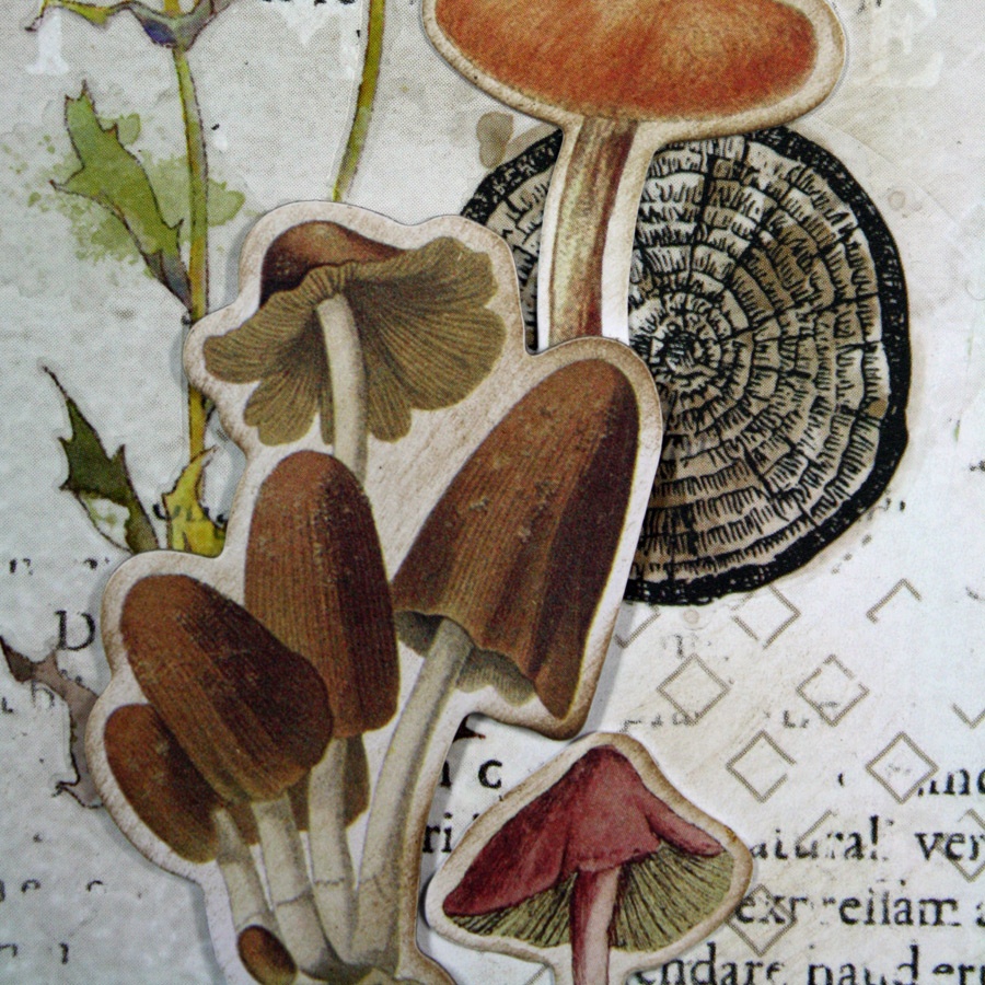 The lower right corner uses rub-ons and chipboard mushrooms and the upper left corner uses chipboard and die cuts – all from the Nature Study Collection.