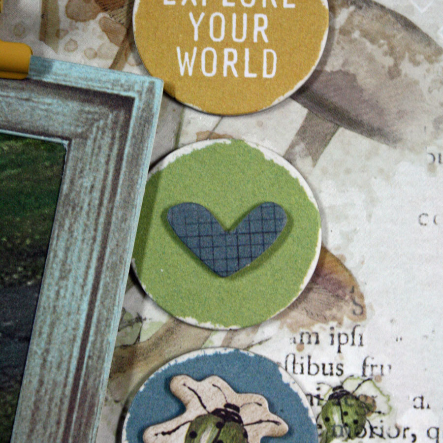 Next to the large photo I used three chipboard circles and added a chipboard ladybug and a heart on top. You can see mushroom and foliage rub-on transfers peeking out from underneath.