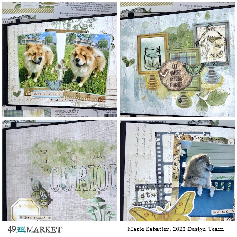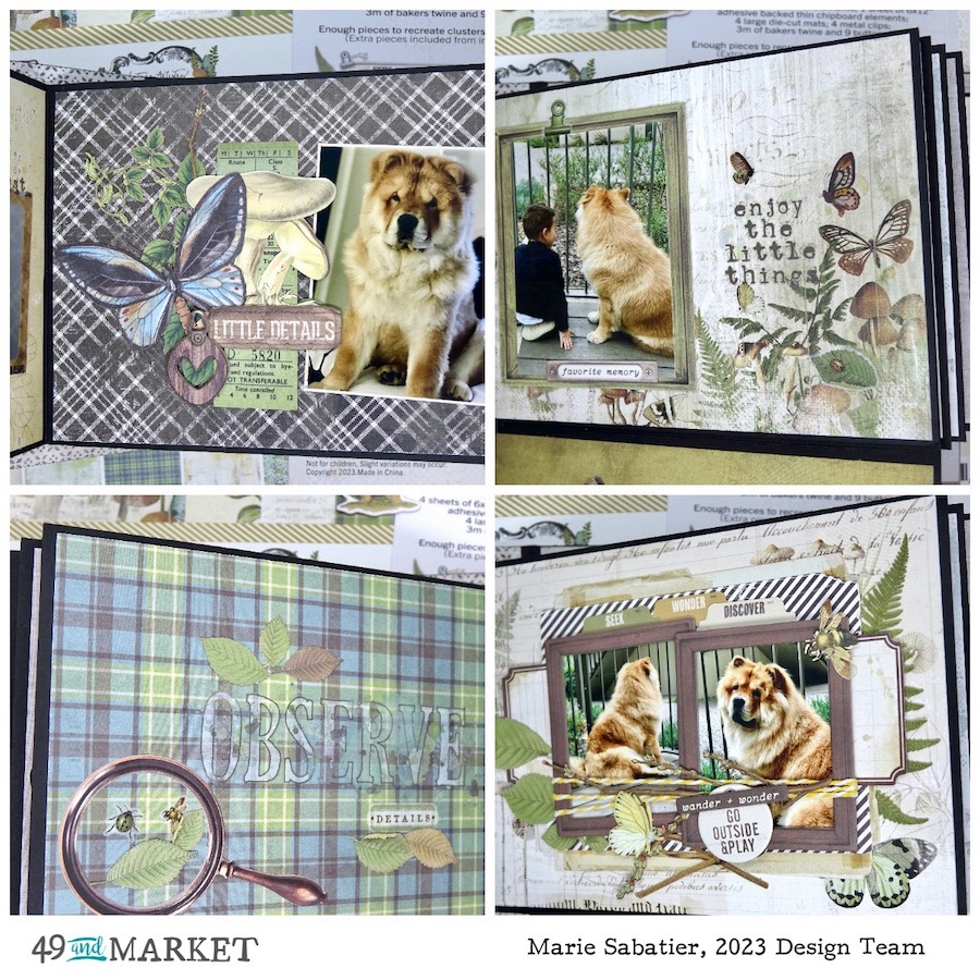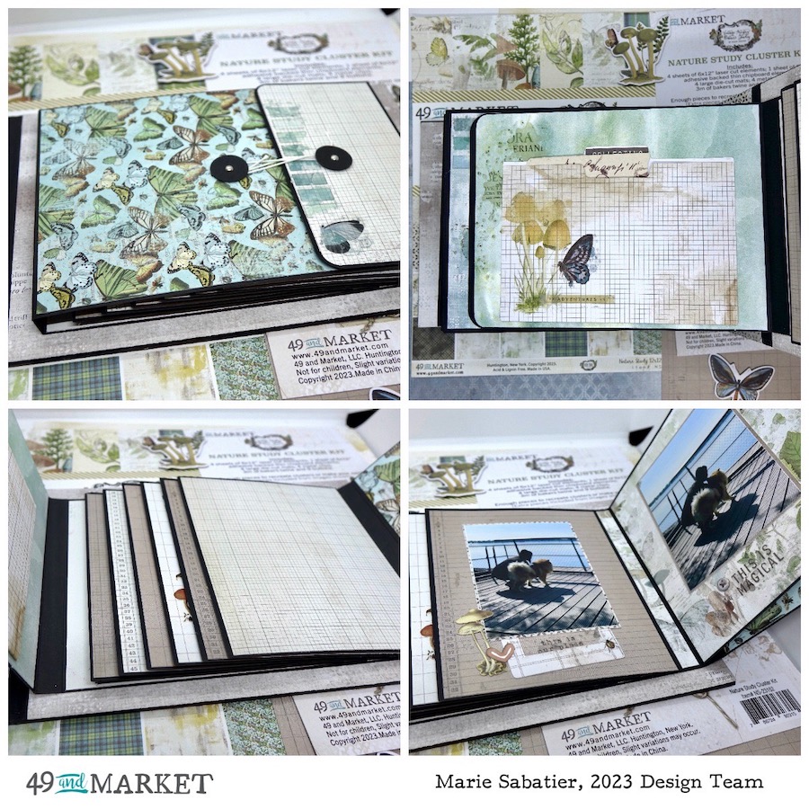 For this I used an album of the CREATE-AN-ALBUM series «Wide Chunky Album Cover» the largest 9.25 x 7 x 3.25 and the entire package of «Wide Book Pages» including two hinges. And a «6×8 Waterfall Enclosure» all in black. The realization of an album cover is not always easy it takes time and precision with this concept it is much simpler and faster. I started by covering the cover using papers of «nature-study-12×12-collection-paper-pack» and «nature-study-12×12-colored-foundations-pack». After having defined the order of the pages and the flaps and before sticking them on the hinges to have more flexibility, I started the decoration. A lot of manipulation but so much fun. I needed the whole package “ nature-study-6×8-collection-pack” and also the “nature-study-6×8-ledgers-and-solids-pack”.