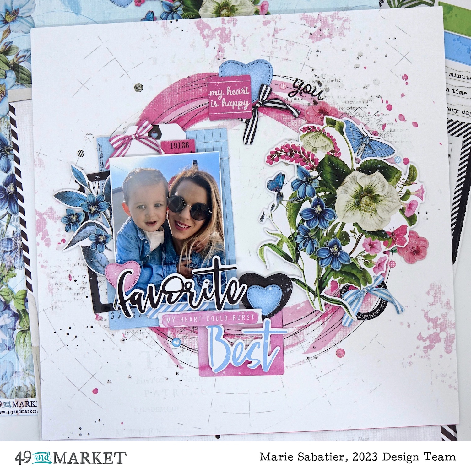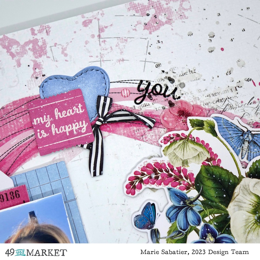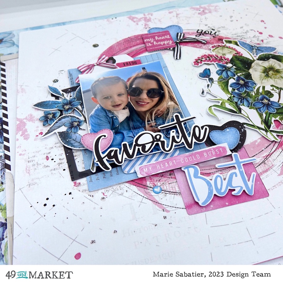 I completely fell for this bouquet of flowers from the blue, pink, white «Gardenia Ephemera Bits» pack. In my archives I found this photo of my grandson and his mother, a perfect harmony of colors. With such a large selection of die-cut, it becomes so easy to make a layout. I use a paper, a tag and a label to create a bunch below my photo. For a little more detail I slipped a black frame from the «Gardenia Filmstrip Frames» pack, a leaf stem and flowers from the «Gardenia Floral Laser Cut Elements» pack. This great «favorite» title always in black to set the tone for my presentation.