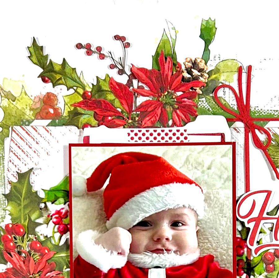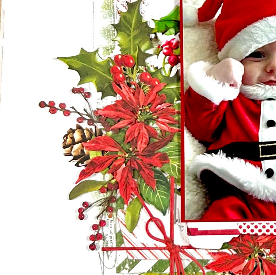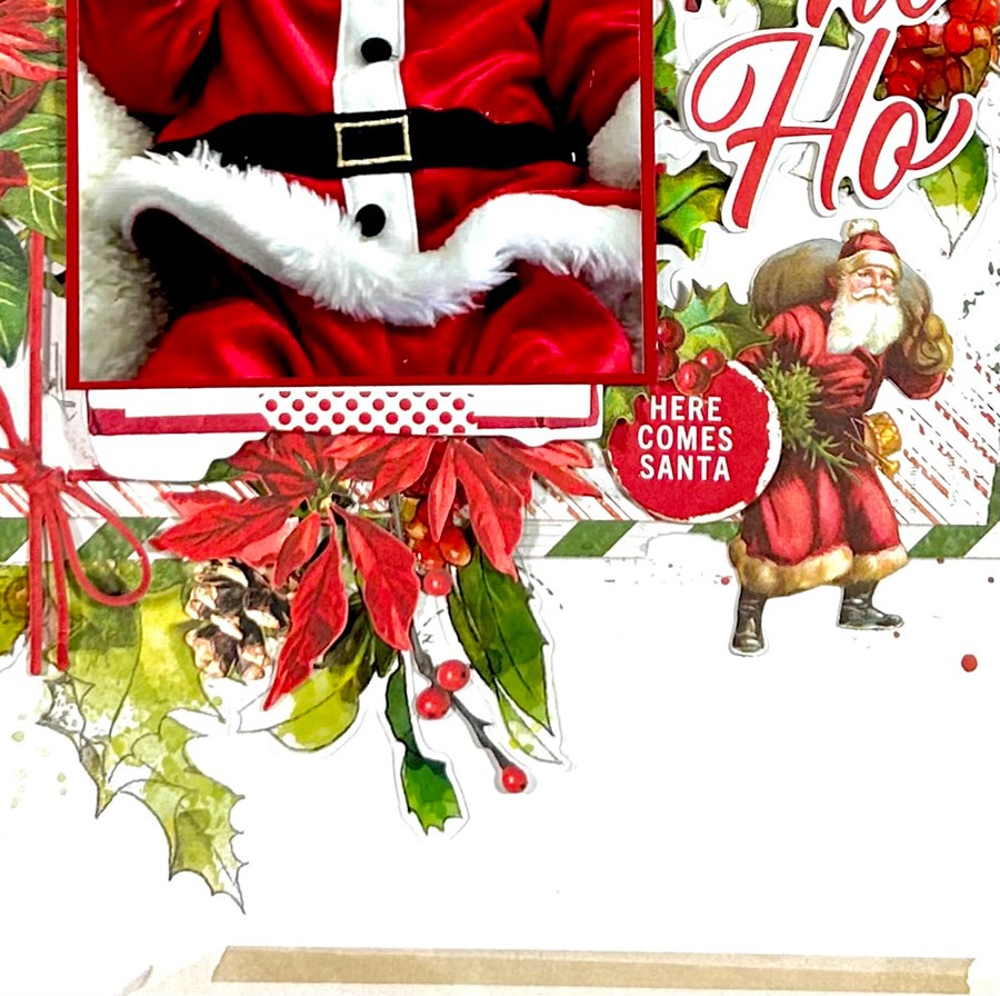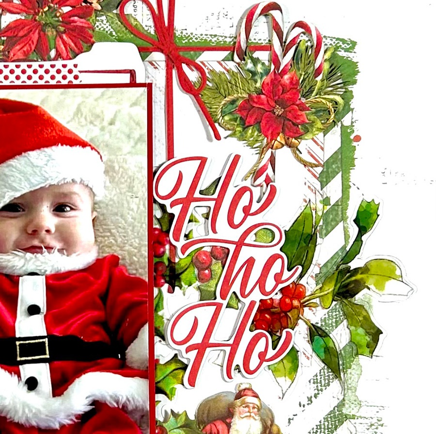 On the right side is where all the other goodies are. The candy canes in the upper right corner are from the General Laser Cut Elements. The title is from the Chipboard word Set and the Santa is from the General Laser Cut Elements. The little circle word sentiment is from the Chipboard Set. I added acetate foliage to the right of the title and an Acetate wreath under the photo just to extend the leaves and berries. All this beautiful green and red from the holly and flowers just make it so festive and merry! I love all of it!
