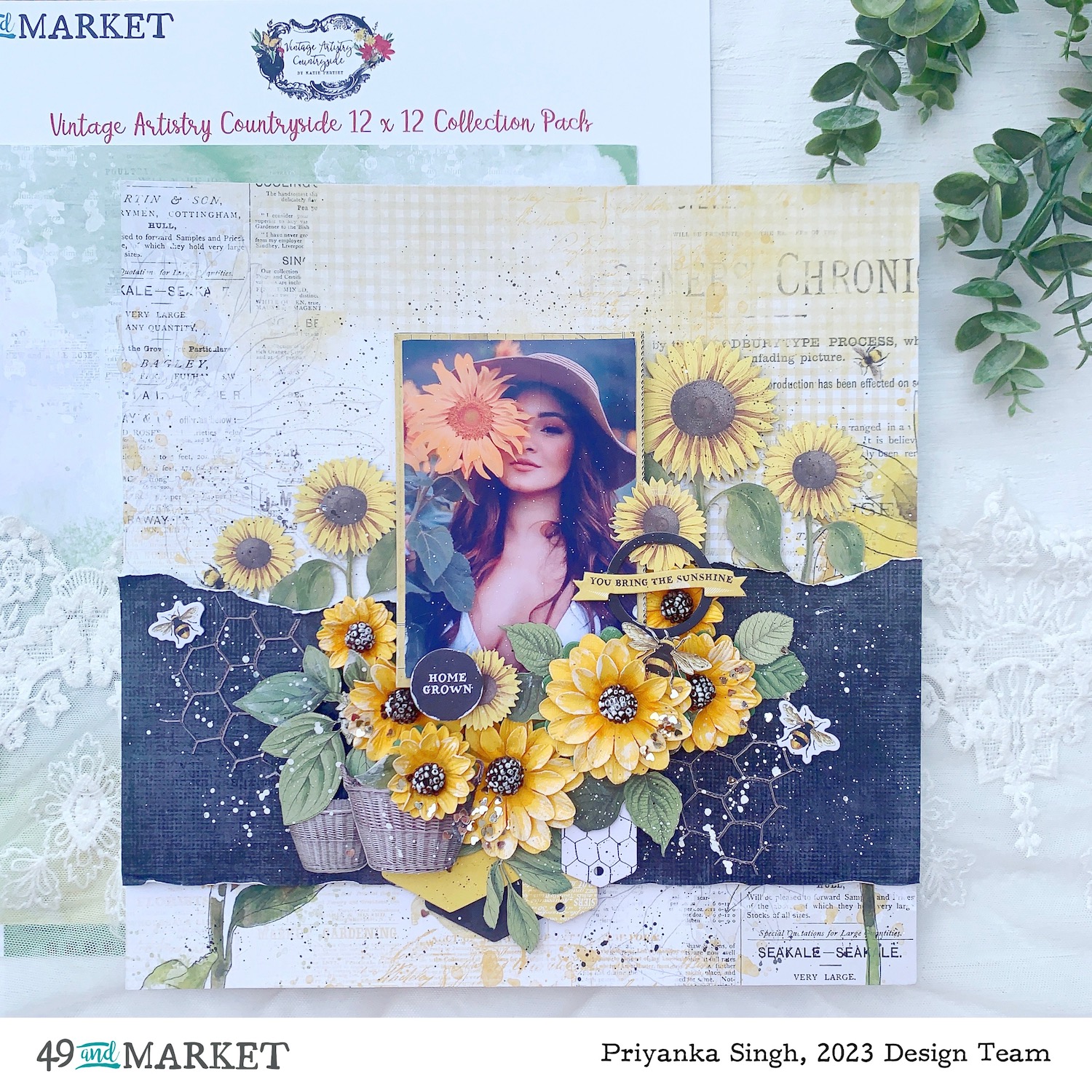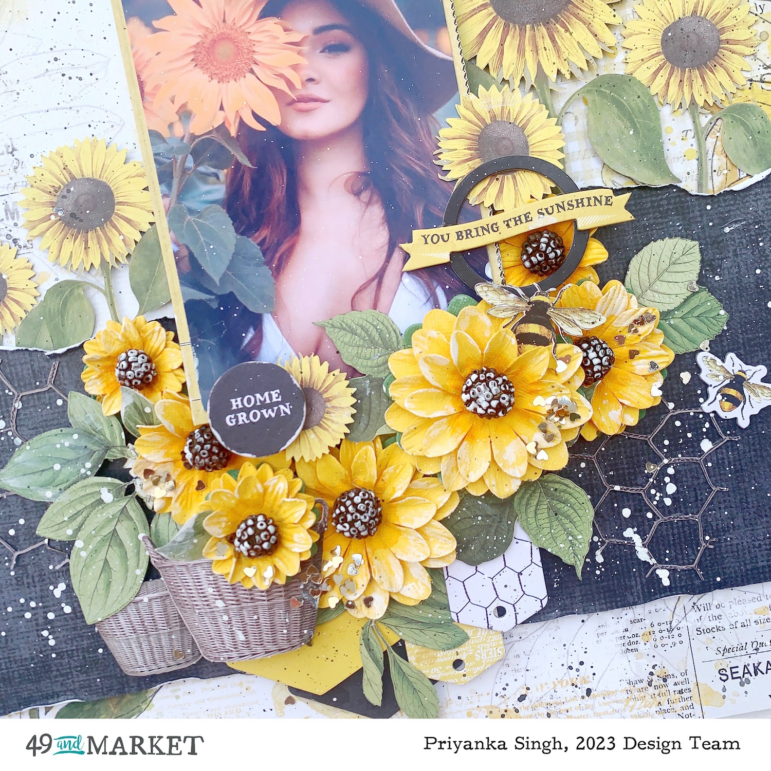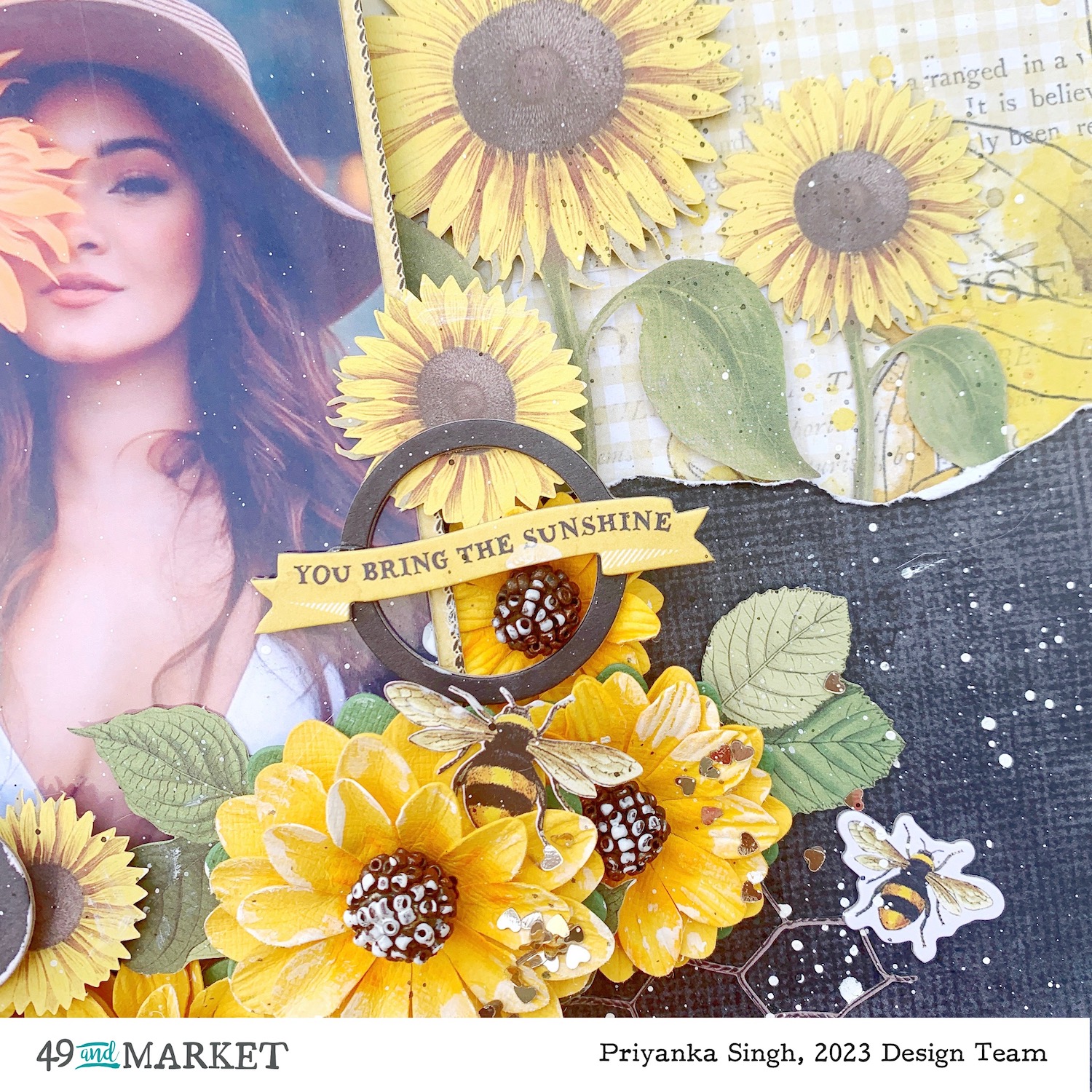 The sunflower-themed scrapbook layout is a bright and cheerful celebration of the summer season. Against a sunny yellow background, a cluster of sunflowers in various shades of yellow and brown dominate the page. The flowers are arranged in a pattern, drawing the eye towards a central picture around sunflowers.