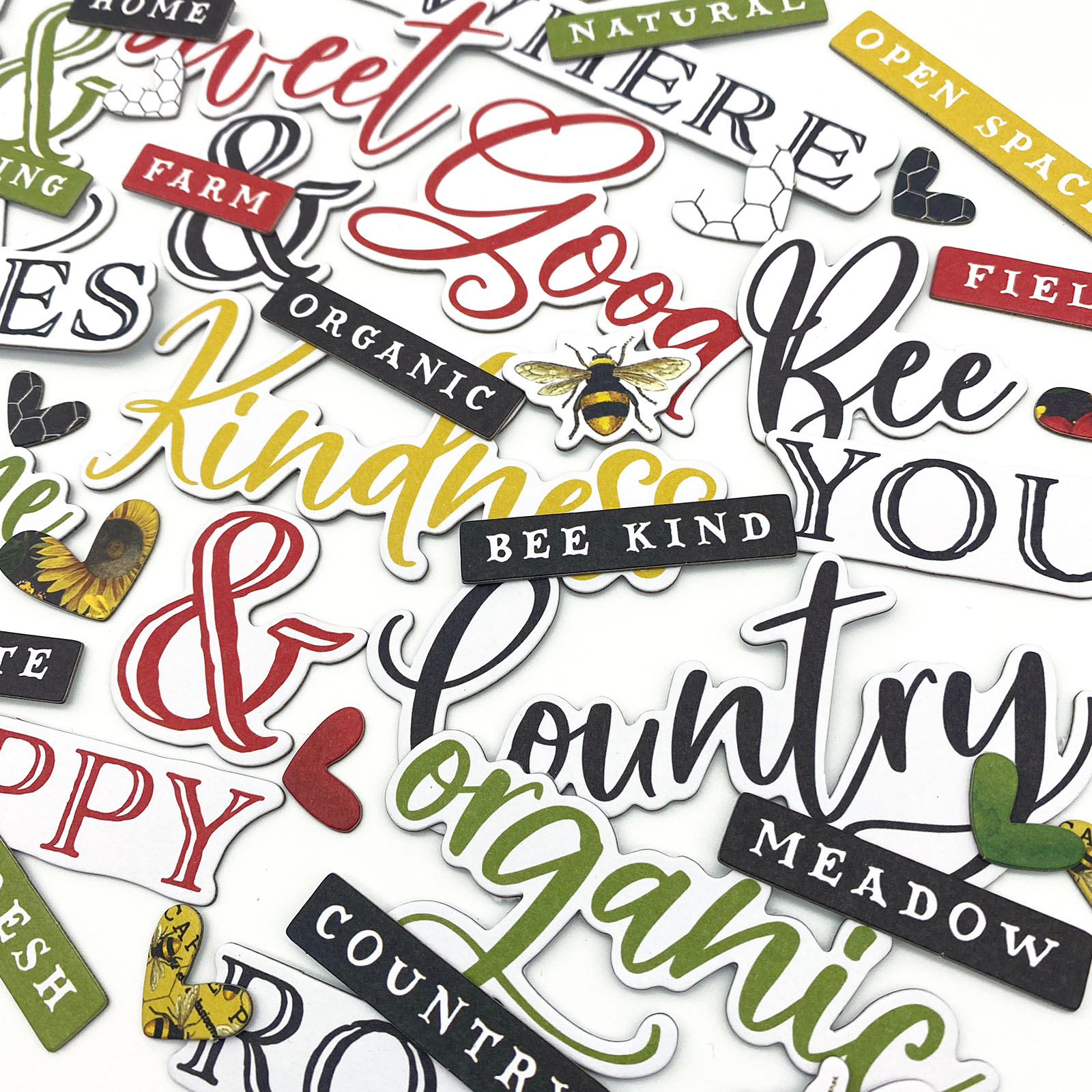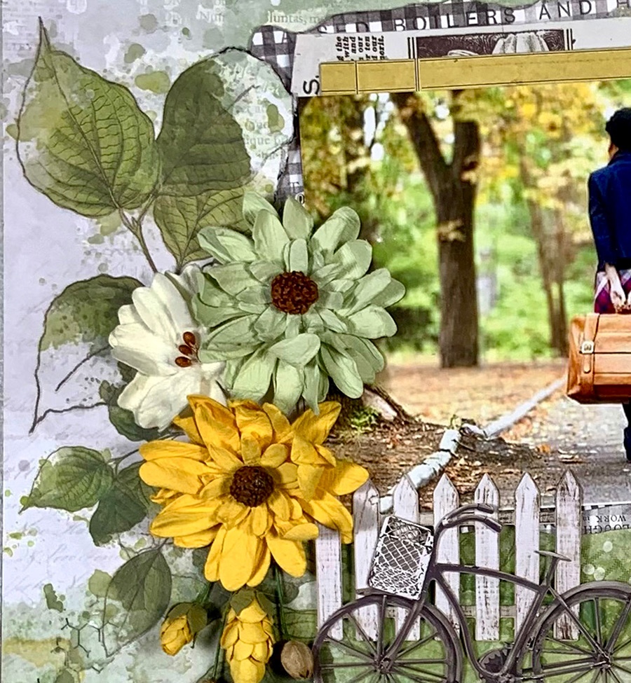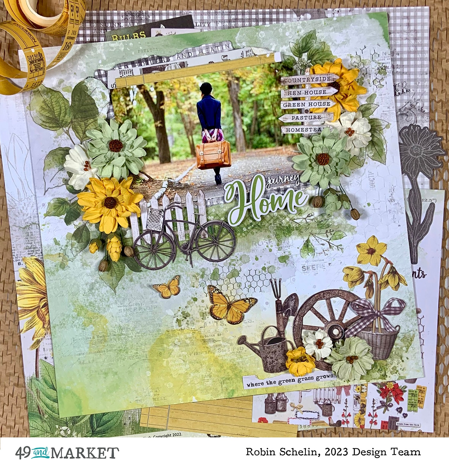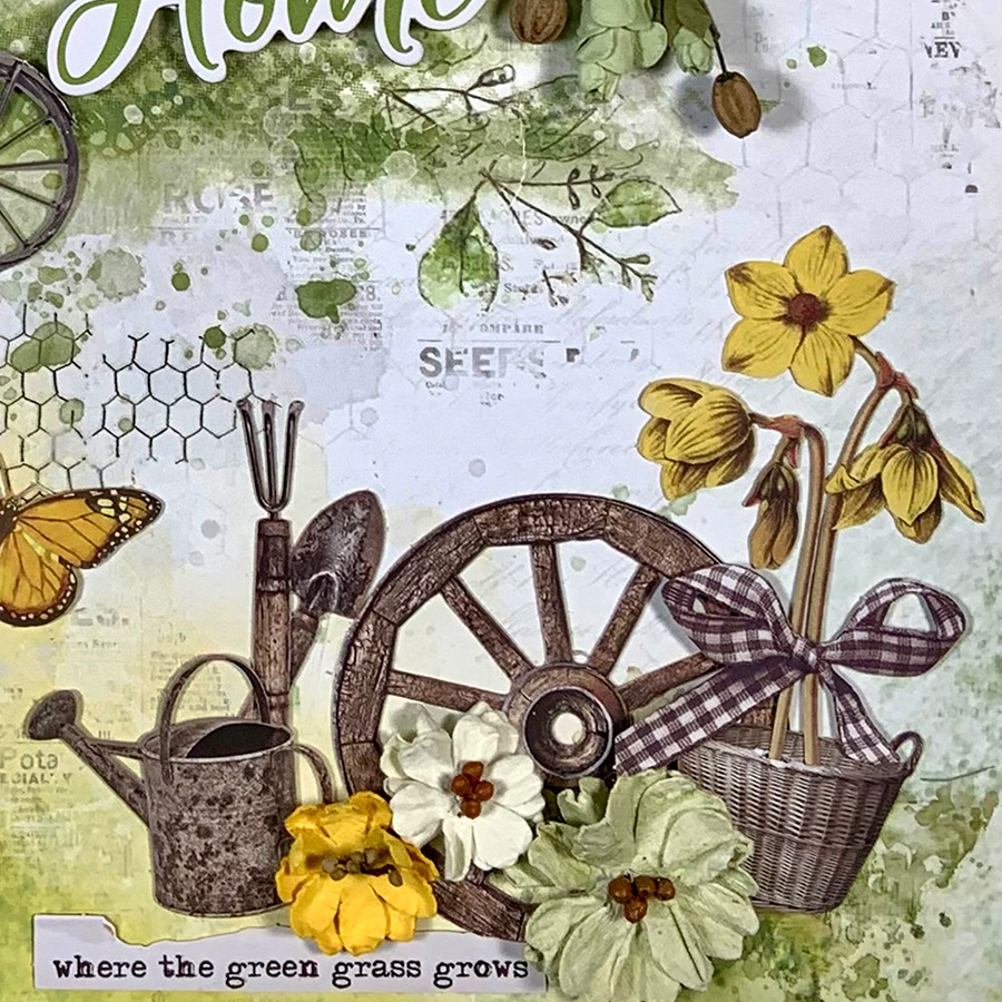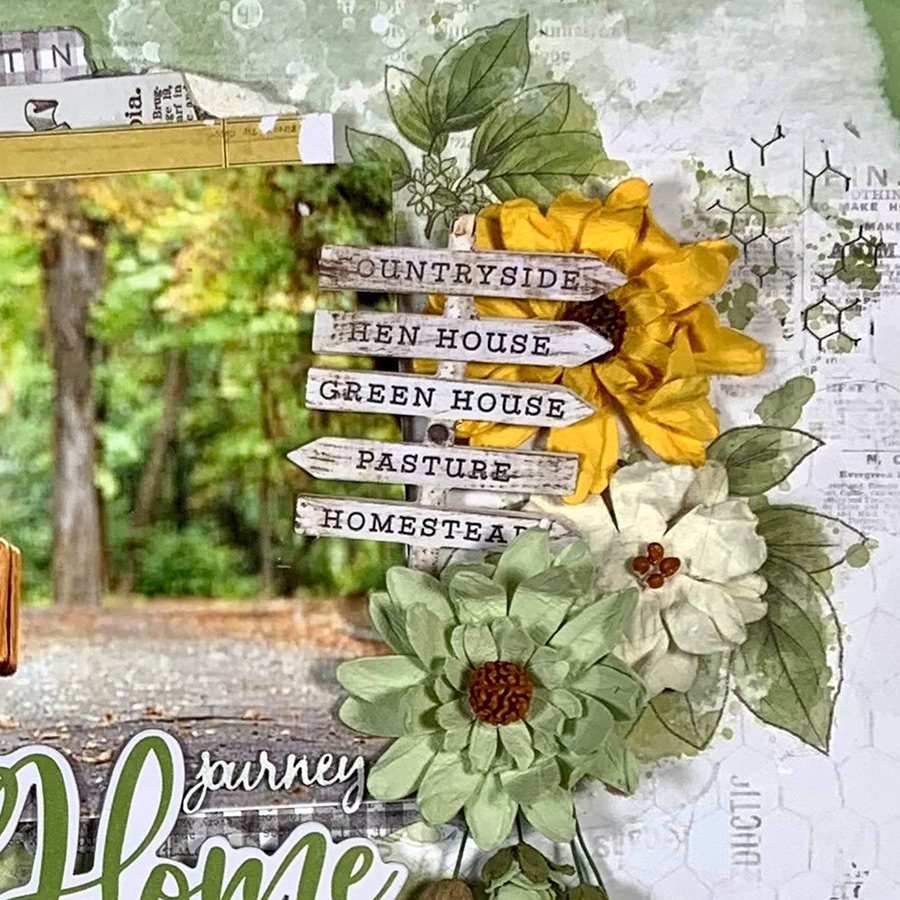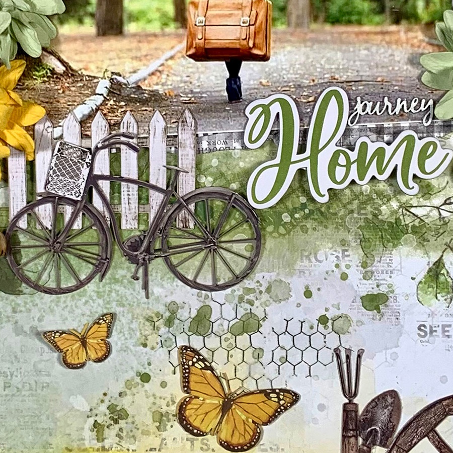 Here you can see the picket fence and the bicycle from the Countryside Laser Cut Elements package. So cute, adding a little more country flair. For the title, I chose the word “Home” from the Countryside Chipboard Word Set. I added a small chipboard word, ‘journey’, from 2Crafty to complete the title. The shading with the leaves under the fence, bike, and title is from the 12×12 Countryside Color Wash Rub-On Transfer Sheet. So, so beautiful to add depth and color! Under the bike I placed a small Chicken wire Rub-on from the Countryside Rub-On Transfer Set, then placed a couple butterflies from the Countryside Laser Cut Wildflowers set. This package of laser cuts is absolutely FULL of flowers and butterflies, leaves and bees! Love it!
