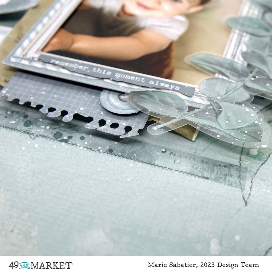While doing my layout, I notice that I am forming a square, I continue by adding a bunch of embellishment on the left side, to give contrast I use white labels of the “color-swatch-eucalyptus-envelope-bits” and I scratch words in rub-on transfer. To close my square, under my photo I add a tape-on transfer (photo 2).