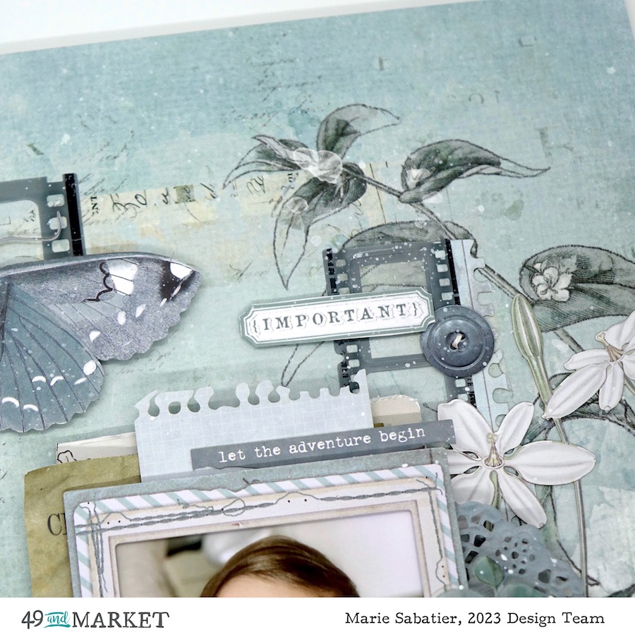 I continue to embellish the right side of my page by adding this splendid branch of white flowers that blends well with the printed background of the paper, a “color-swatch-eucalyptus-acetate-filmstrips” label on which I scratch the word “IMPORTANT”. I also add this wonderful butterfly.