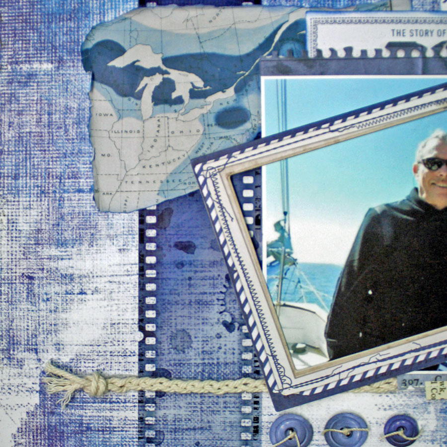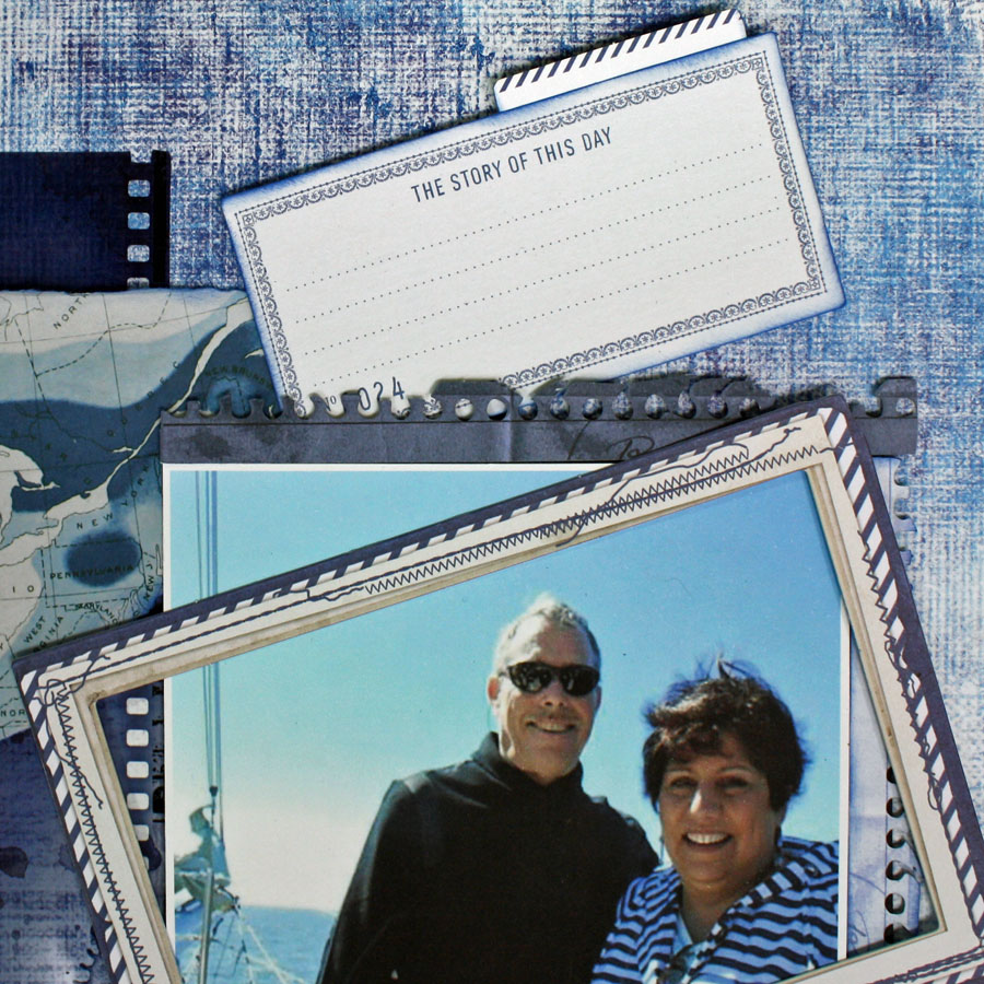 I ended up tearing a piece of one of the Collage Sheets and distressing the edges a bit (love the map!). Added layers to the photo so that I could hide an Envelope Bit for journaling behind the photo. One of the Laser Cut Elements served as a pull tab for the journaling.