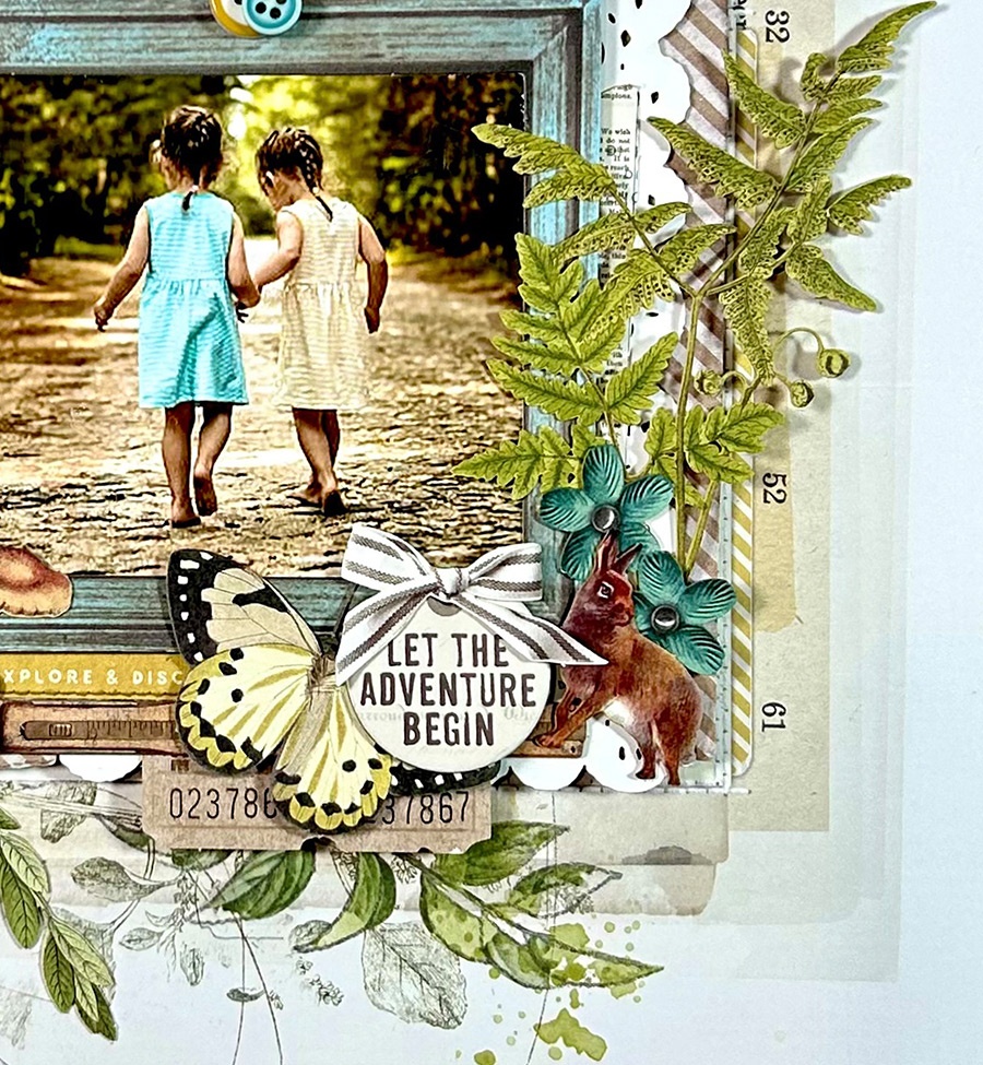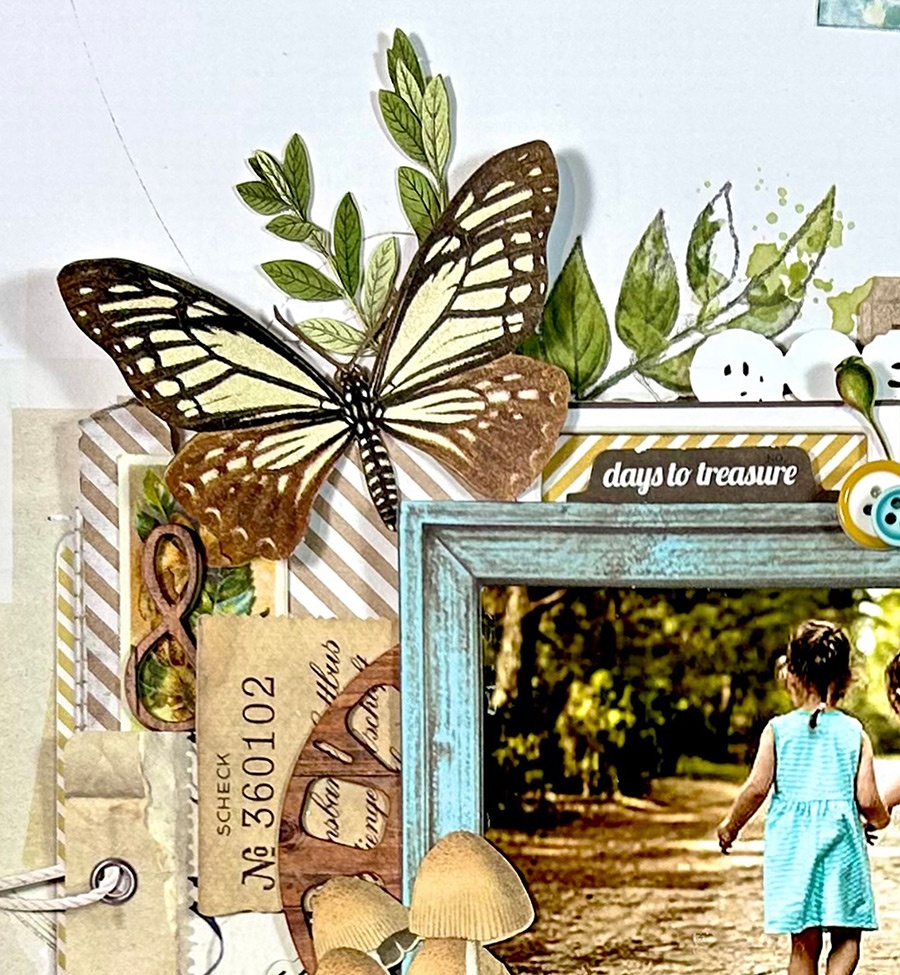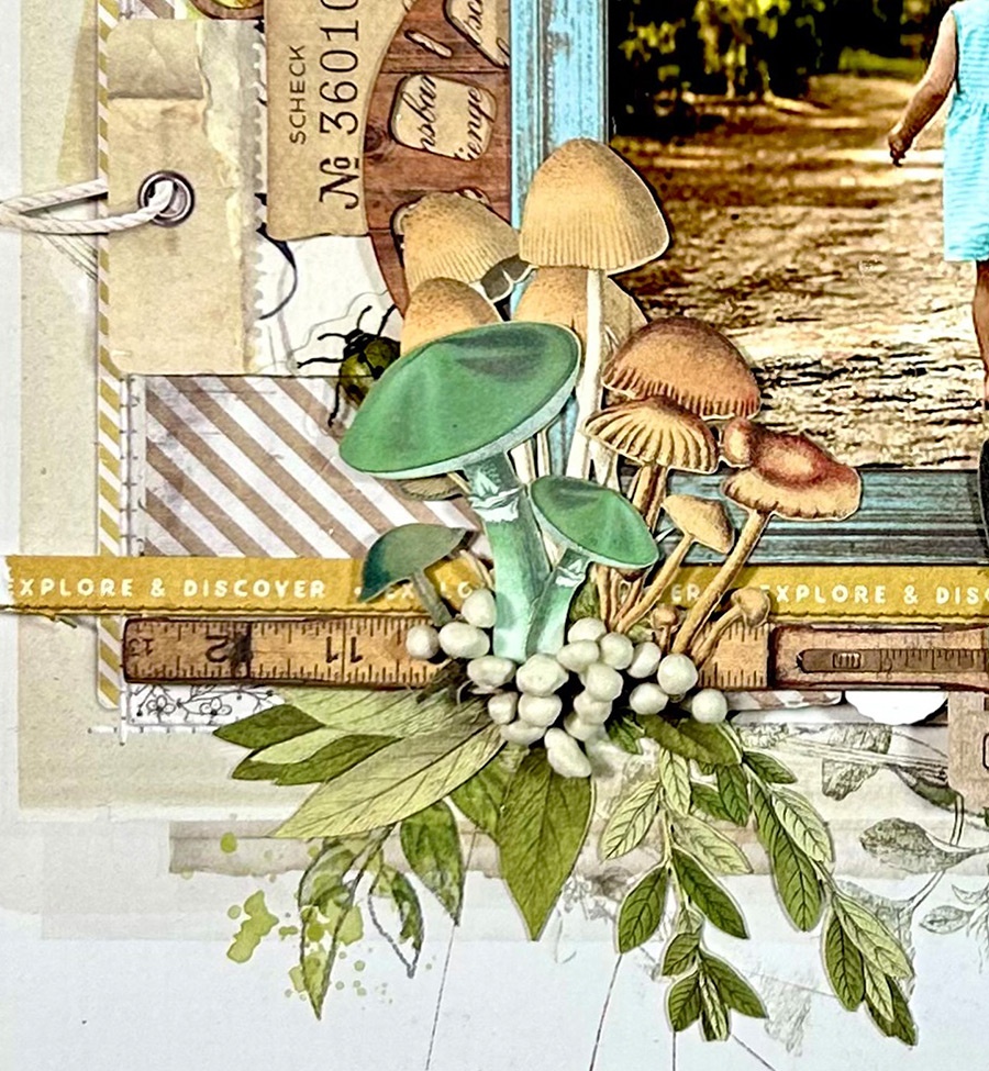 The mushrooms here are from the Nature Study Mushroom and Foliage Laser Cut Elements. Again, it was all about scale. I needed bigger ones than the ones in the Page Kit. I added a few Finnabair Art Stones here to make it look even more outdoorsy on top of that beautiful cluster of leaves.