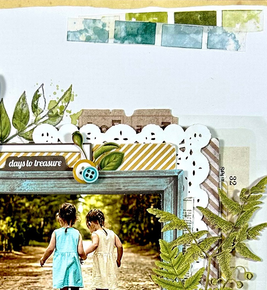 Up top here on the right, more layering under the photo with the little buttons for accent. I used Pallets Fabric tape here on the top of the layout and on the bottom. I felt I needed a little more blue color. With most of this layout in earth tones, and the color of the little girls dress being blue, this tape seemed to add just enough blue to pull the whole color scheme together.