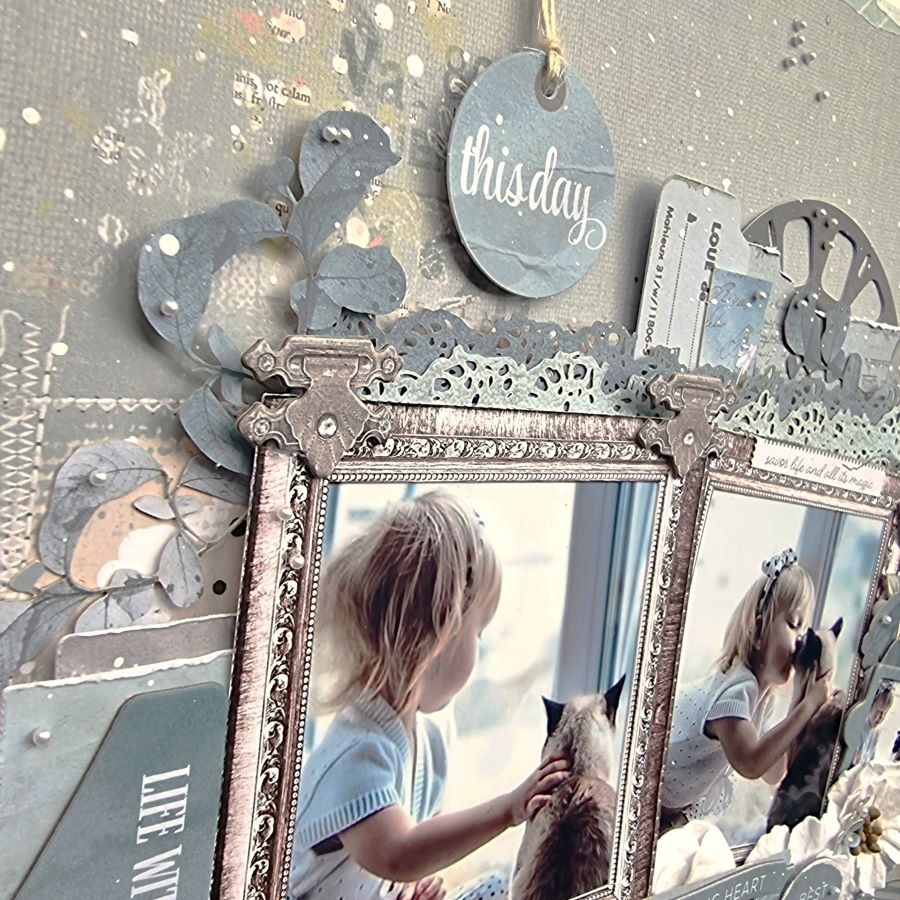 I have used the reverse side of the Vintage Artistry Moonlit Garden paper “Thoughtful” from the 12×12 Collection pack. The photos were adhered to the chipboard frames that I used out of the Moonlit Garden Cluster kit. The photo on the right is adhered under the photo on the left (I wanted the left frame to be raised higher than the right frame), on which I then added chipboard under the frame on the left before adding layers of Moonlit Garden Ephemera behind both frames, as well as the “lace” bits from the lasercut elements. Where the Ephemera stuck out on the left of the frame, I have added a chipboard piece “Life with you” as my title.