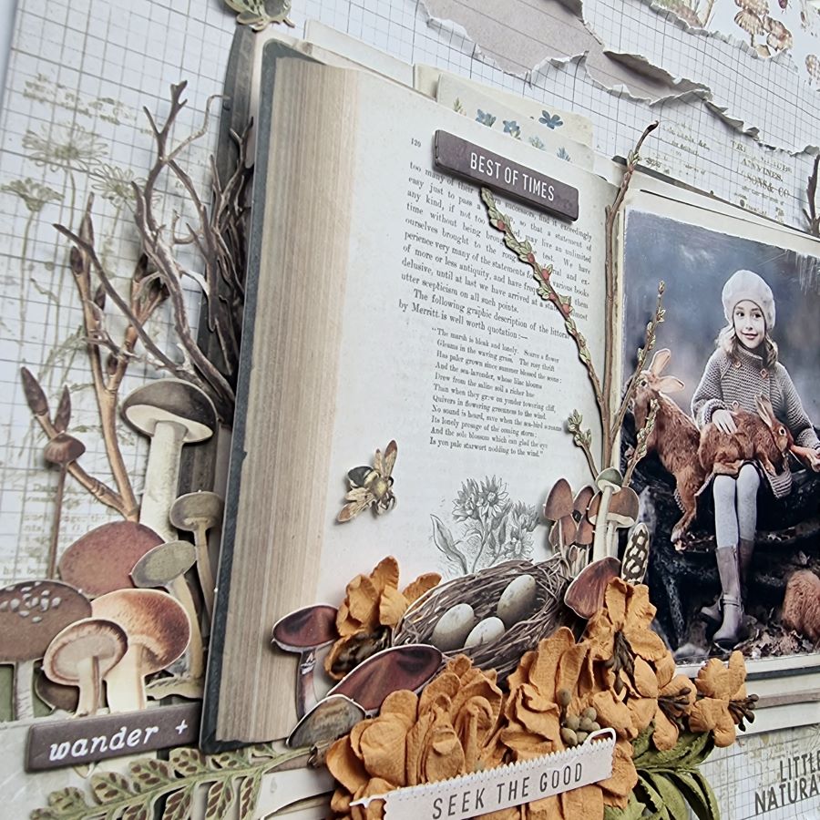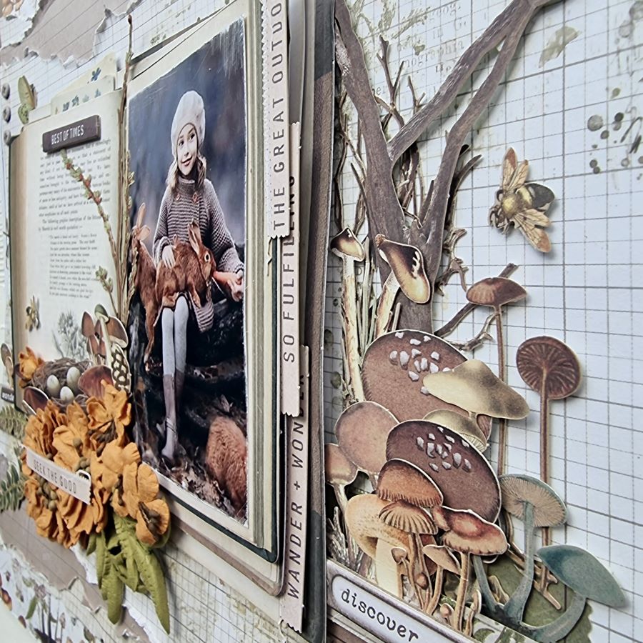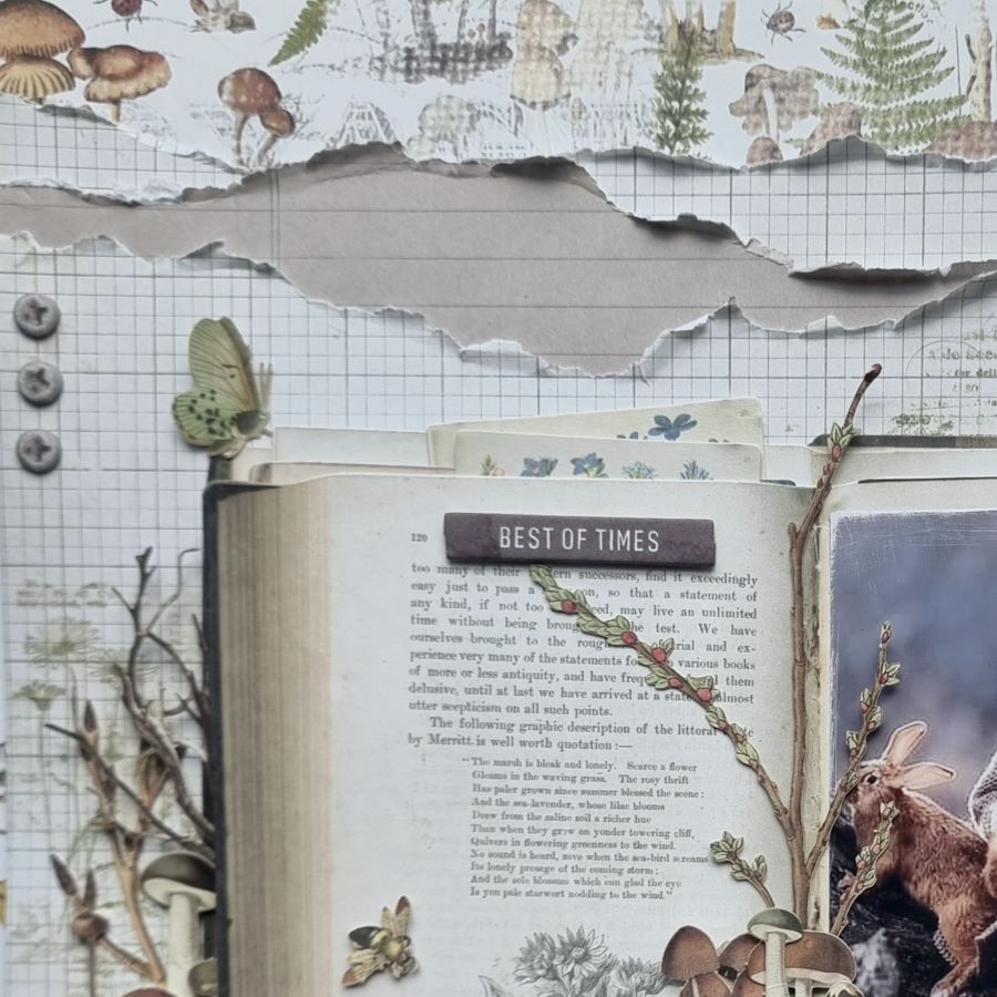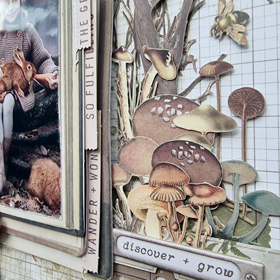 I have then used wording as tabs from the Vintage Artistry General Laser Cut Elements. From here I added mushrooms from the Laser Cut Mushrooms and Foliage set and the trees from the General set and created layers of mushrooms on either side of the book using foam tape.