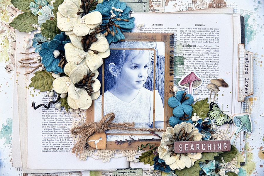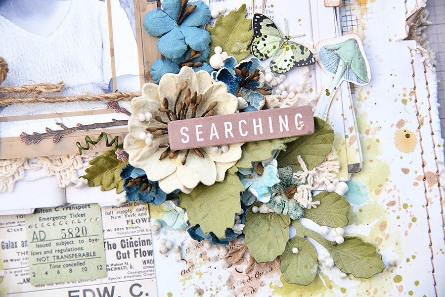 I chose 5 different flower collections for the flower clusters. The beauty of the flower collections is that so many of them coordinate with each other, so you only have to use a few from each package. I scattered or tucked in some laser cut mushrooms and butterflies. And I placed the Searching sentiment from the Nature Study Ephemera Bits, over the floral cluster.