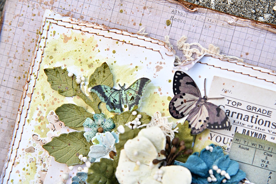 I used pieces of the lacey trim in cream, tucked in the flower arrangement as well as the frame, and the outside of the background paper. I machine stitched around the edge of the paper sewing a double row. I snipped the thread and paper in some parts and distressed the edge. Once the layout was complete, I spattered some ink, and watered down some of it, to paint on the page.