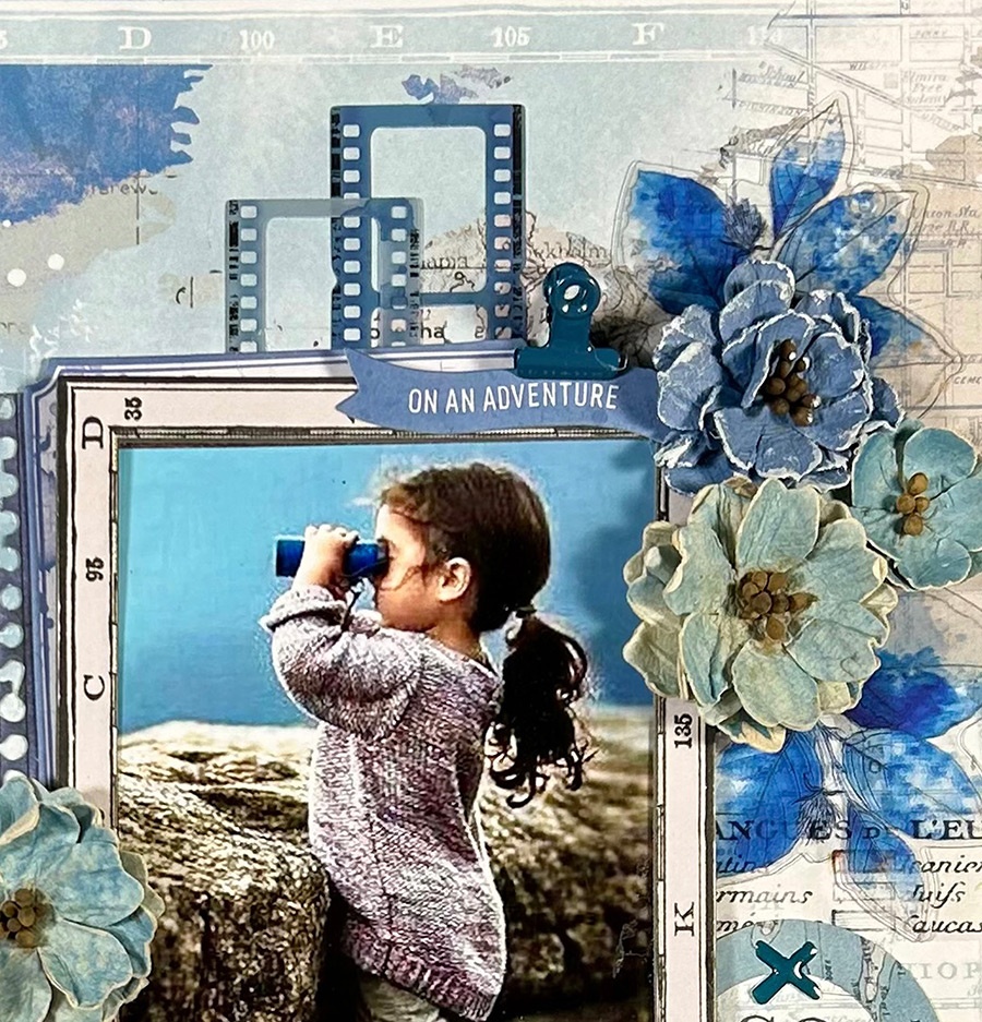 I used the Everywhere Mapping the World paper for my background. This paper is so beautiful, I hated covering up Europe with my composition, but it had to be done! I added small bits of rub-ons from the Everywhere 12×12 Sentiments Rub-on Transfer sheet on the bottom left corner and up on the right side to add contrast to the blue. Then I started with the filmstrips from the Everywhere Filmstrip Frames package. I used four of the smaller ones, running them down the center behind the photo. This was to create uniformity with the top and bottom of the layout. I matted the wonderful photo with one of the Everywhere Chipboard Map Frames, along with another frame from the Everywhere Ephemera Bits under that. I then added the little torn notebook strip from the Inkwell Laser Cut Elements on the left side. I used one of the clips from the Everywhere Ultimate Page Kit that’s holding the little sentiment strip also from the Ephemera Bits. Then to complete the top, I placed a couple of leaves from the Inkwell Acetate Leaves under the Rustic Bouquet Bluejay flowers.