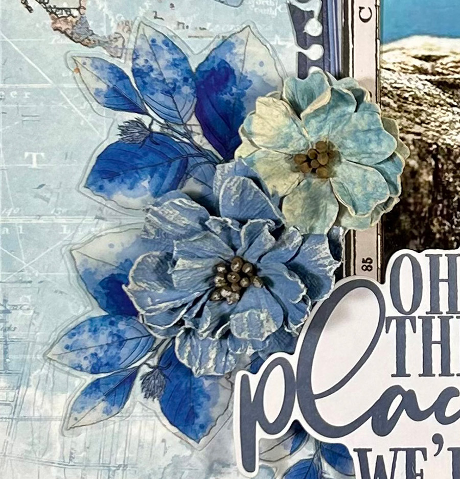 On the left side of the layout, I added some more of the Inkwell Acetate Leaves. I am in love with the acetate leaves included in the Color Swatch collections. I use them ALL the time! So beautiful and perfect to accent the floral clusters. Yum Yum! Here I also used the same flowers as up top on the right, Rustic Bouquet Bluejay. I brushed them slightly on the ends of the petals with white gesso to soften them up a bit. Just lovely!