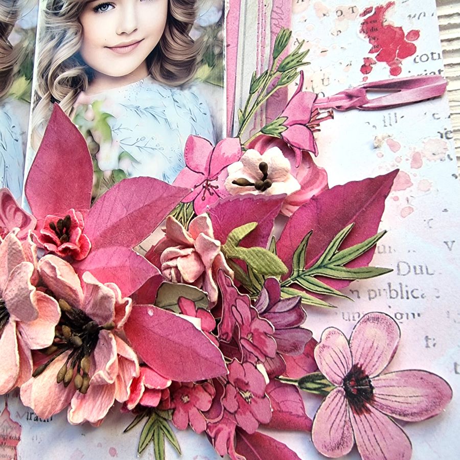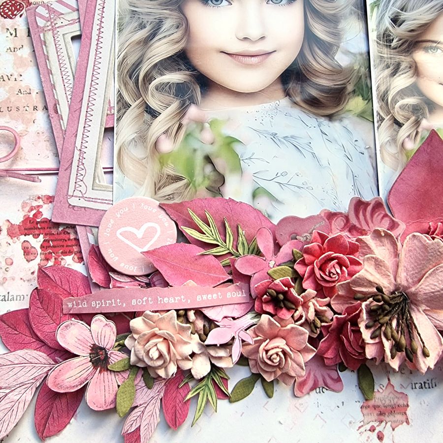 The X X X is stitching elements from the Blossom 6×8 rub-on transfer set – these are really cute! I adhered my matt to the page with foam tape in the centre, as I added rub-ons after I had stuck this down, using the page with all the splotches and wording from the rub-on pack. I cut these into pieces and arrange around my layout. I then began to create my flower cluster – using the two biggest flowers out of the Wildflowers Punch paper flower pack and building out my cluster with smaller flowers (also using Taffy Florets paper flowers), and elements from the Blossom laser cut elements sheet. A little tip – I don’t always use the full element that comes off the sheet – I tend to cut these, or shape them to create my clusters. The little quote “wild spirit, soft heart, sweet soul” is also from the Blossom laser cut sheet. The circle with the heart is from the Vintage Artistry Tranquility Chipboard words pack.