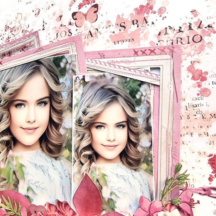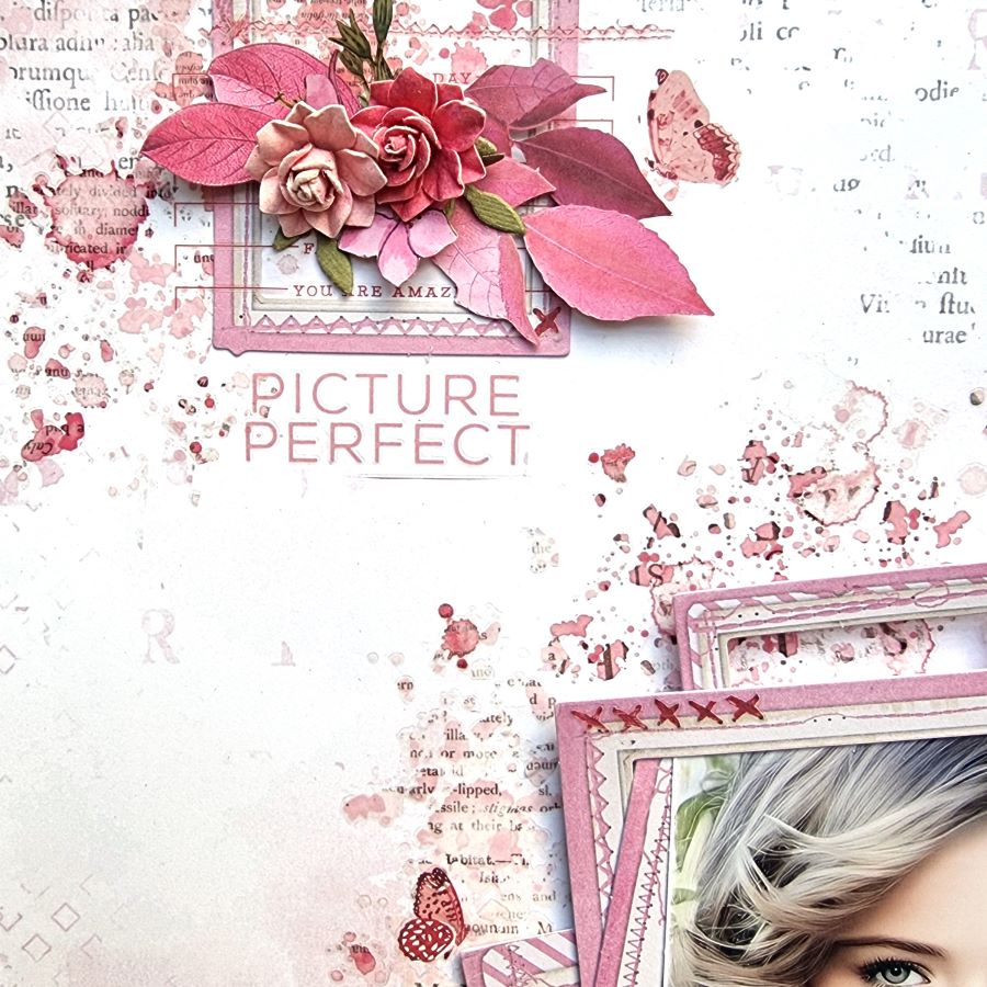 I then created a smaller cluster feature at the to of the page. I first added some splotch rub-ons and then cut the frame so that it was flash up to the edge of the page, I then added more rub-ons (words and stitching) over that frame before creating the flower cluster. I then added the title “Picture Perfect” from the Blossom 6×8 rub-on transfer sheet.