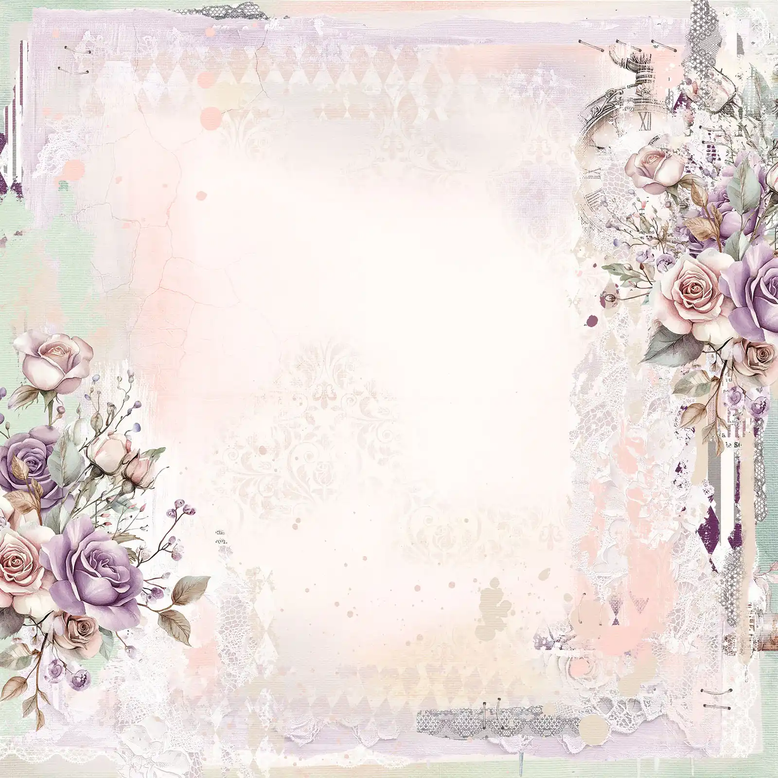 A fresh take on a classic aesthetic, the Echoes of Time collection re-imagines steampunk with a modern twist. The 12×12 papers bloom in a delicate palette of mint, soft pinks, and serene lavender. These textural pages are adorned with intricate designs, blending vintage gears and delicate clockwork with elegant florals, creating a unique and captivating backdrop for your creative projects.