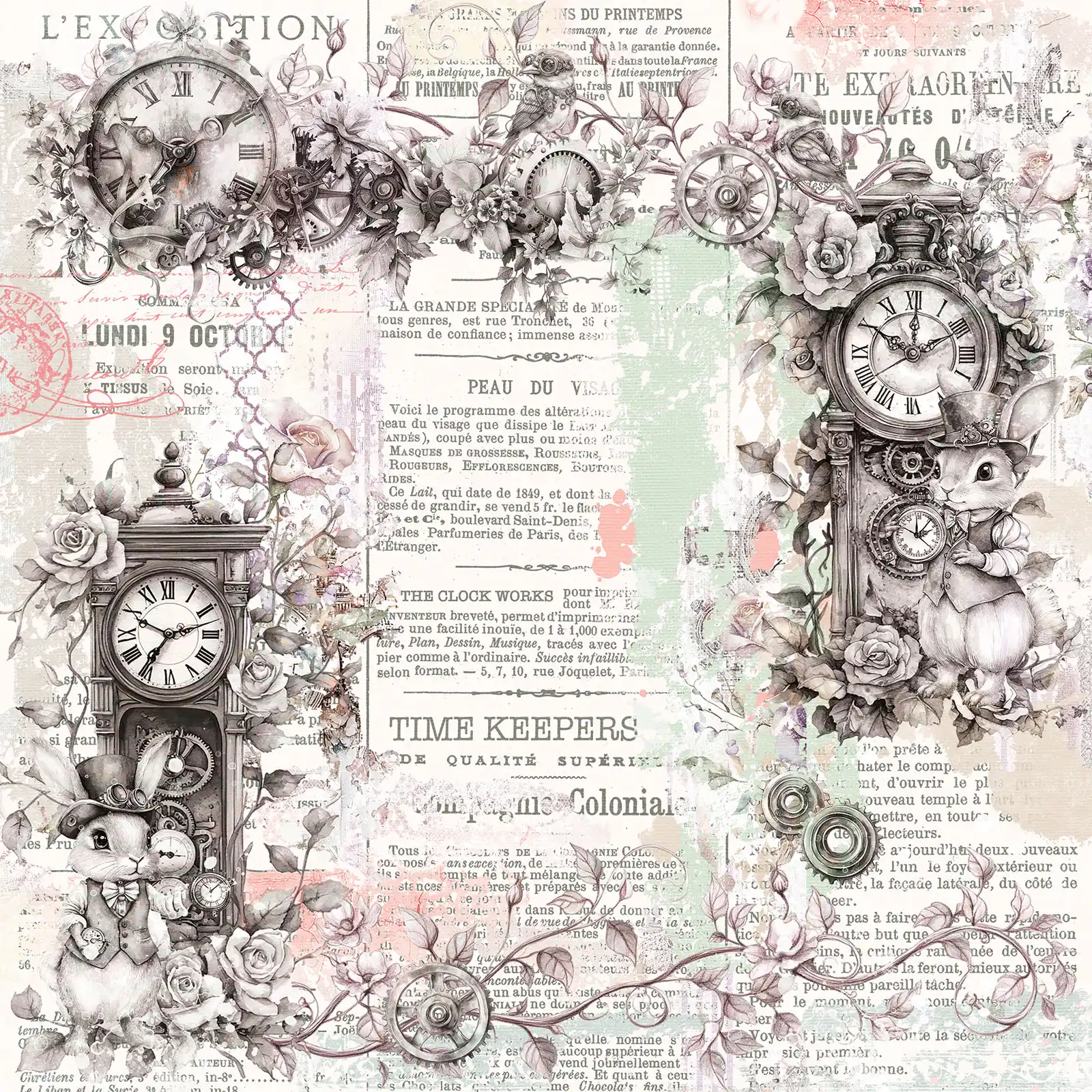 A fresh take on a classic aesthetic, the Echoes of Time collection re-imagines steampunk with a modern twist. The 12×12 papers bloom in a delicate palette of mint, soft pinks, and serene lavender. These textural pages are adorned with intricate designs, blending vintage gears and delicate clockwork with elegant florals, creating a unique and captivating backdrop for your creative projects.