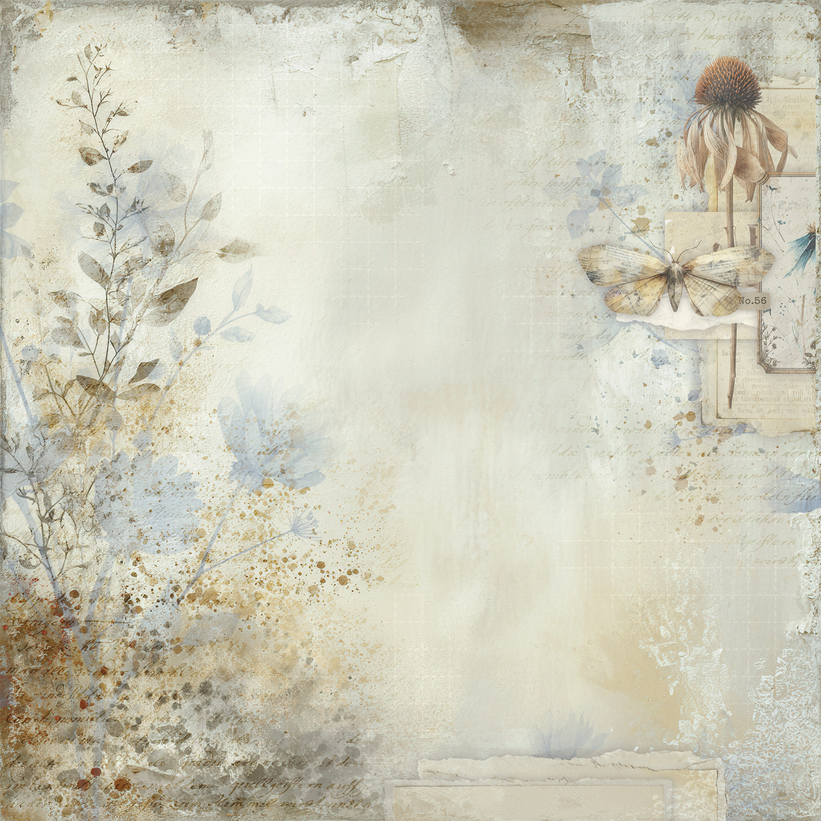 Each individual paper in the Faded Memory Lane series is a standalone work of art, blending ethereal botanical sketches with the grit of weathered textures and vintage ledger scripts. The palette is a sophisticated mix of dusty blues, warm creams, sepia, and muted pinks, designed to evoke the feeling of a cherished, time-worn memory.