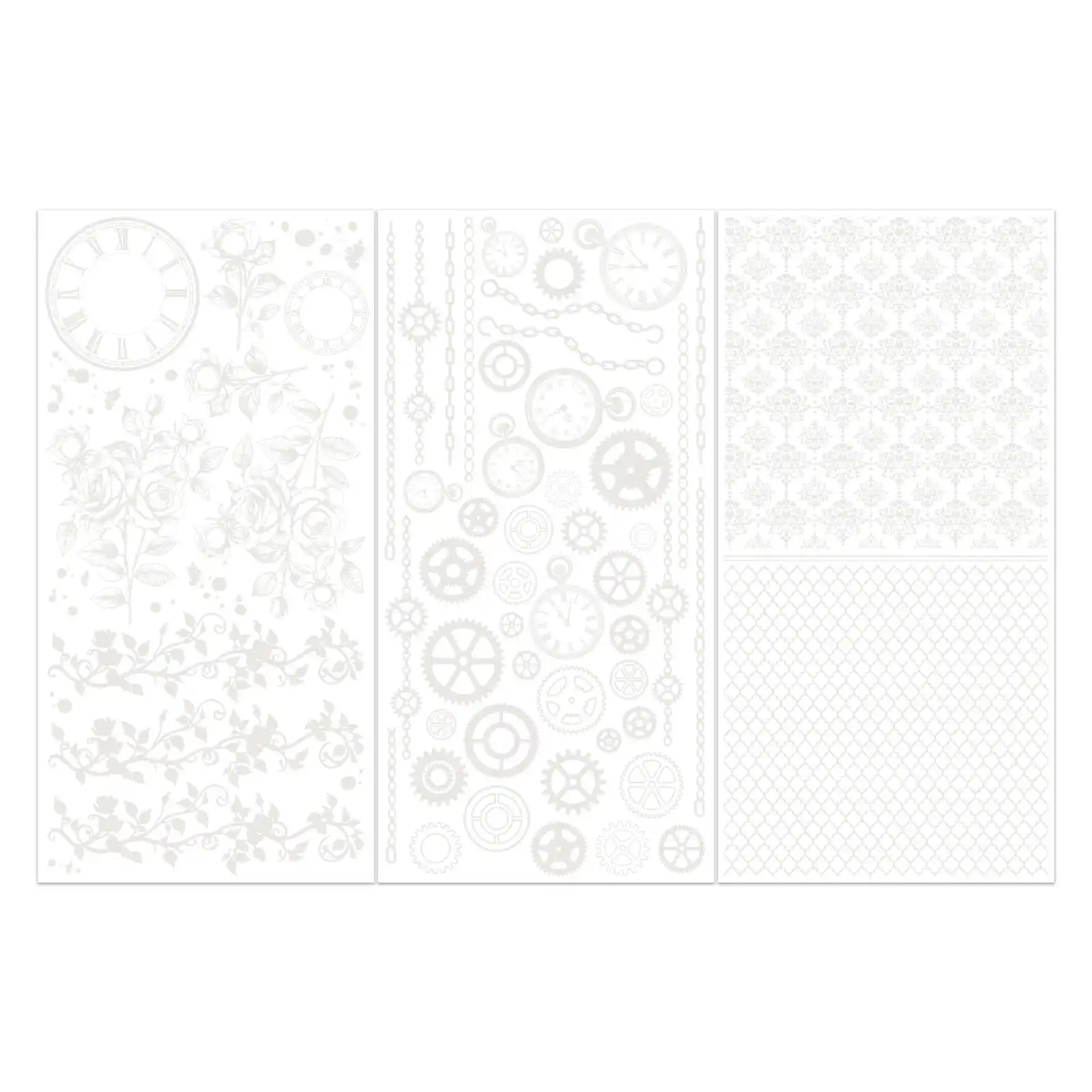 Discover the magic of mixed media with the new Irresistible Rub-on Transfers from 49 and Market. These innovative white rub-on transfers feature new technology that creates a no-halo background, eliminating the ghostly effect often seen on dark papers. This unique feature also allows you to add ink directly over the transfers to resist the design, opening up a world of creative possibilities. The Irresistable Times set from Joanne Bain includes vines, cogs (gears), and various textures. These rub-ons are typically used in scrapbooking, card making, and other paper crafts to add intricate details and a vintage or steampunk aesthetic.