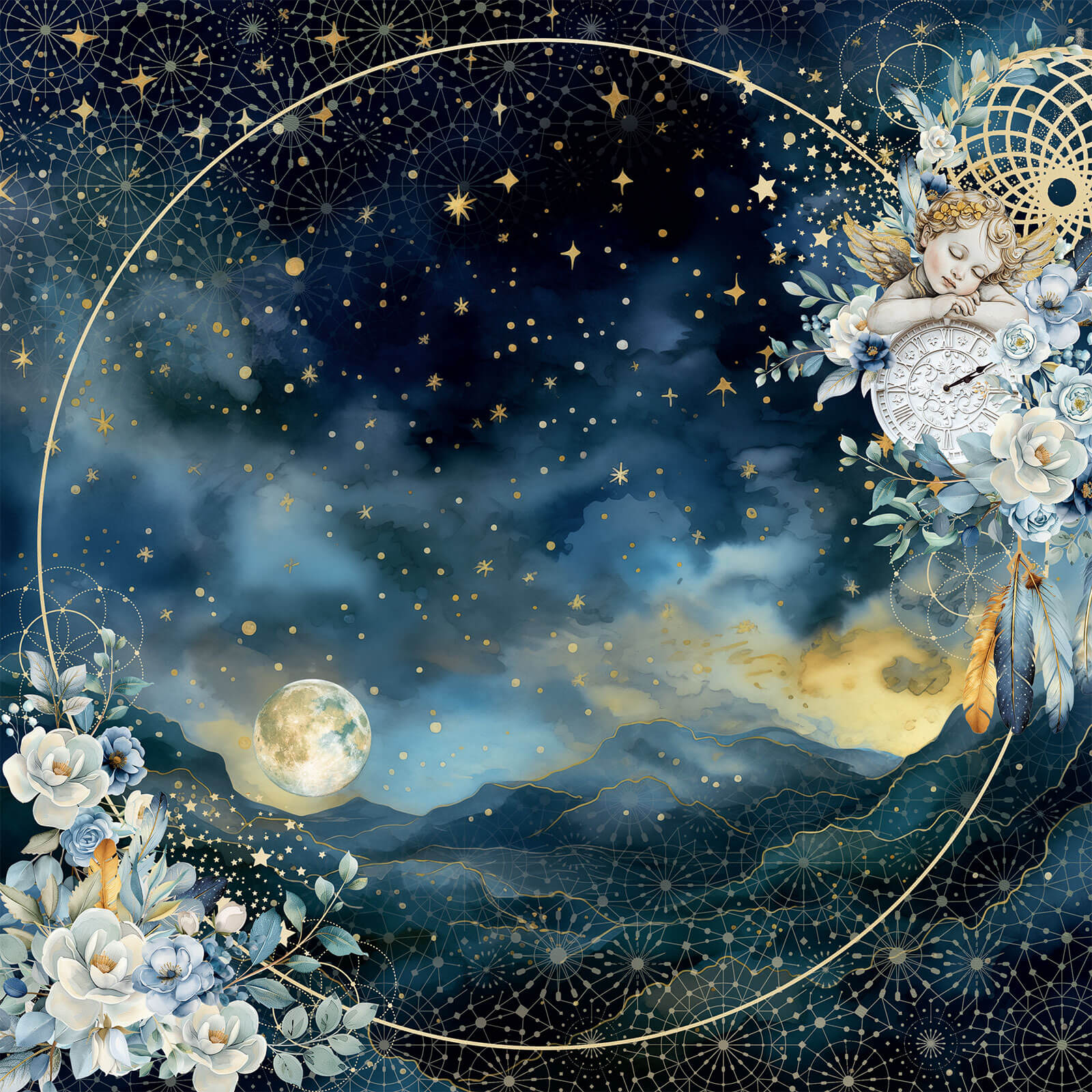 Starlight Dreams paper invites you to gaze upon a canvas of navy, sprinkled with celestial shades of blue and shimmering gold. This collection evokes the magic of a starry night, adorned with a constellation of beautiful motifs.