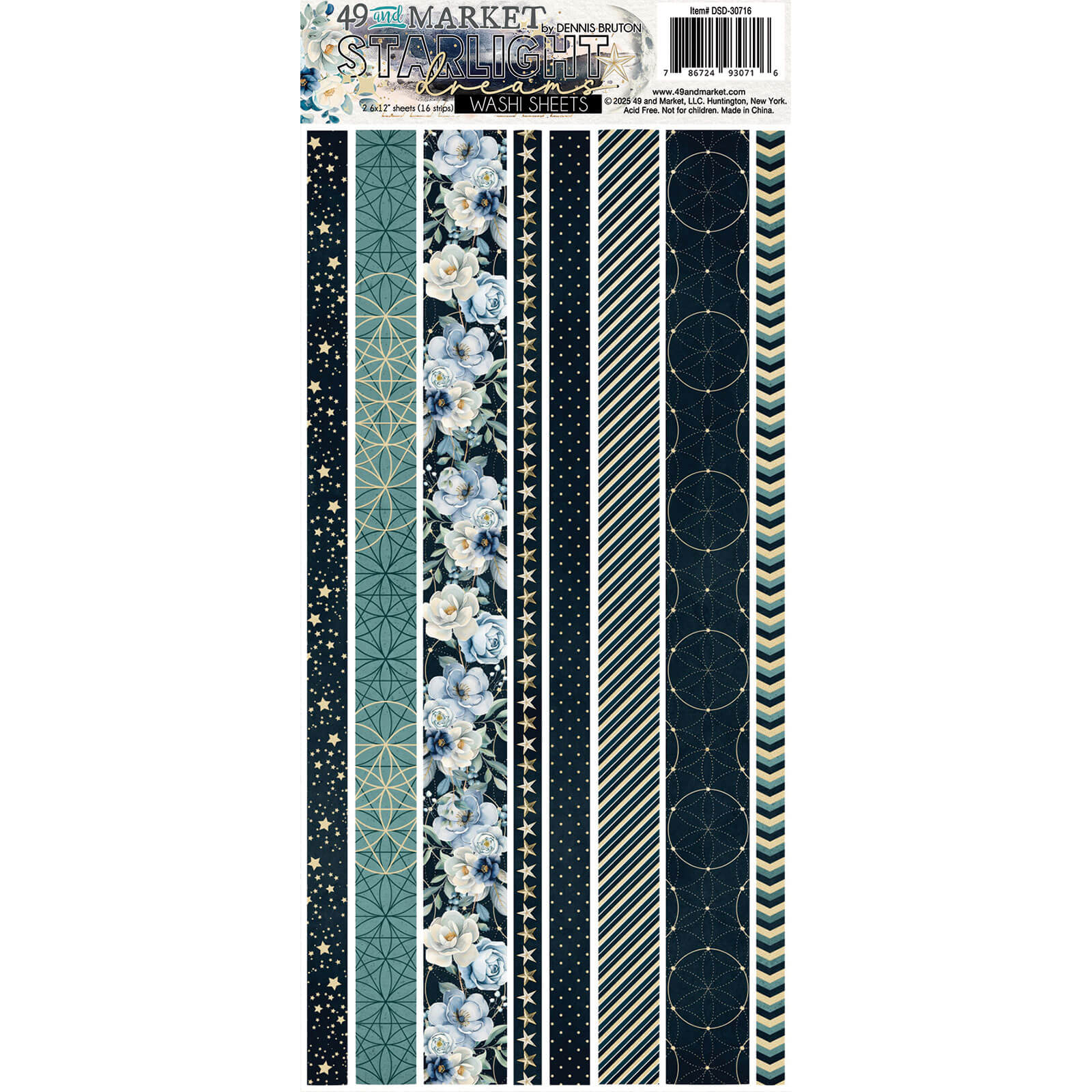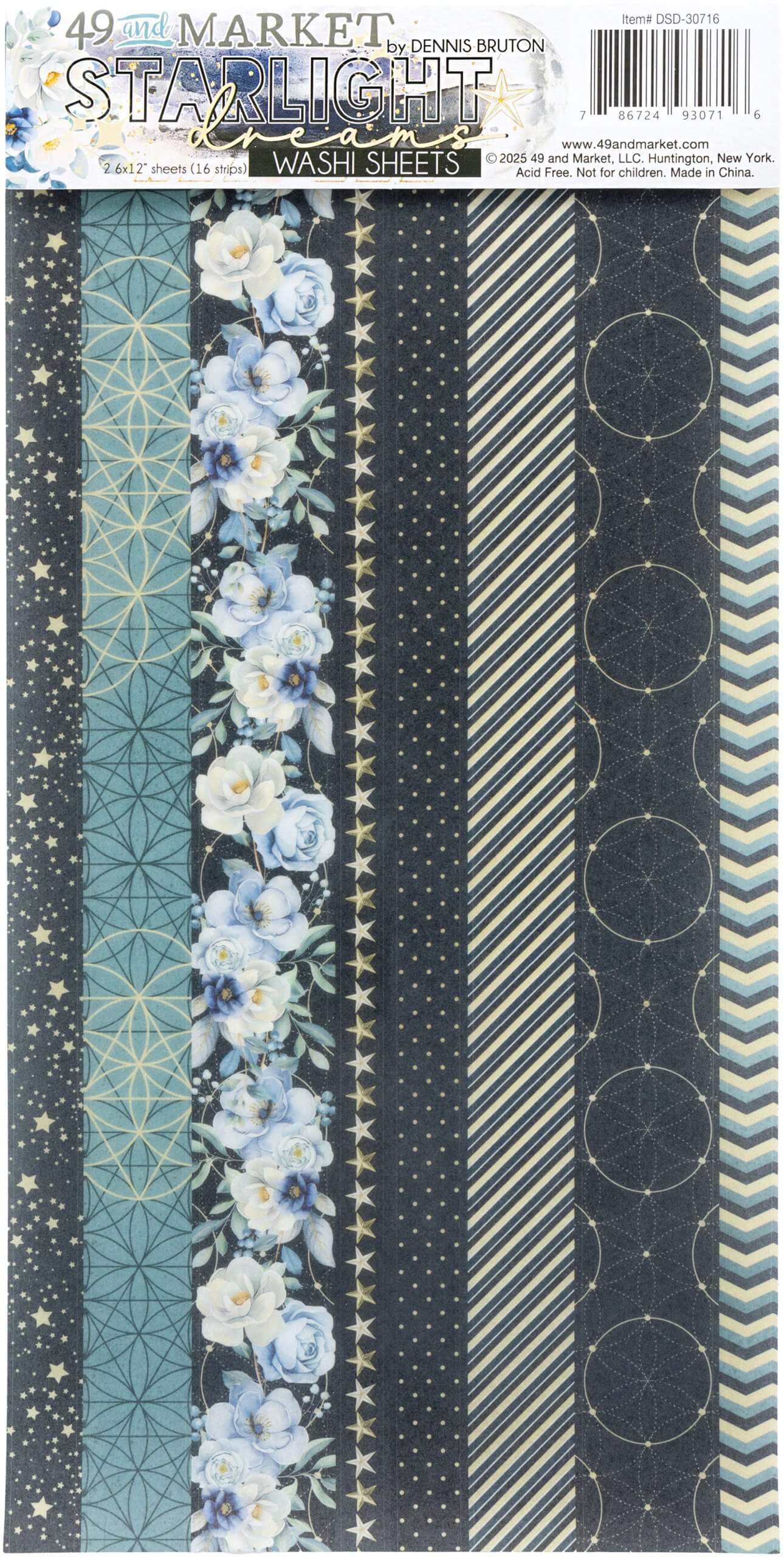 Escape into a celestial wonderland with our Starlight Dreams washi strips. These enchanting strips feature a mesmerizing design of twinkling stars, playful stripes, cheerful chevron, and delicate dots, all bathed in a dreamy palette of blues and gold. This pack includes two identical 6×12″ sheets, each containing 8 unique washi strips in a varying widths, giving you double the creative possibilities. Use them to add a touch of magic to your journals, planners, scrapbooks, and more.