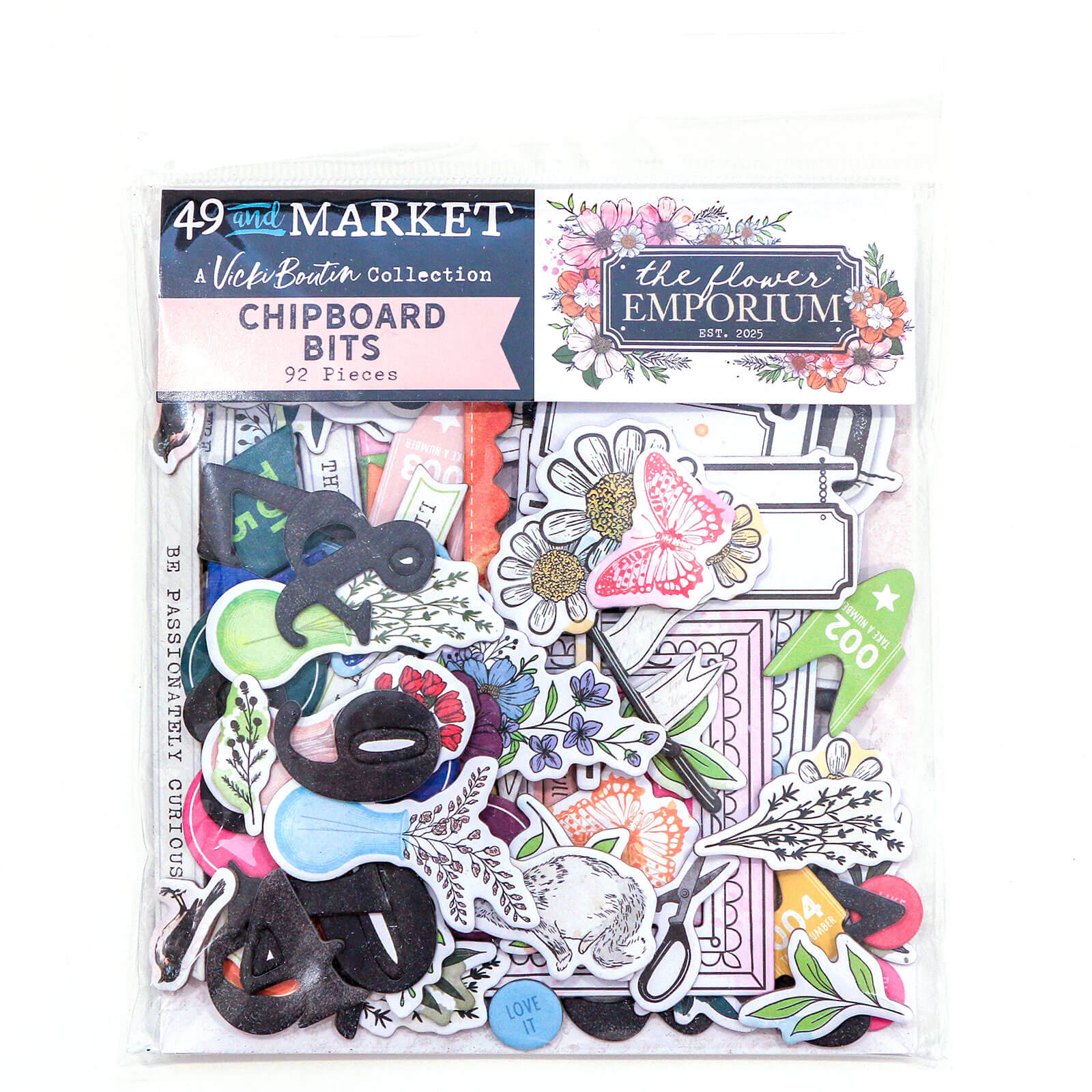 “Vicki Boutin’s Flower Emporium Chipboard Bits provide a wealth of embellishment options for your crafting needs. This pack contains 92 assorted chipboard pieces, including: A variety of numbers for llists, dates and ages;