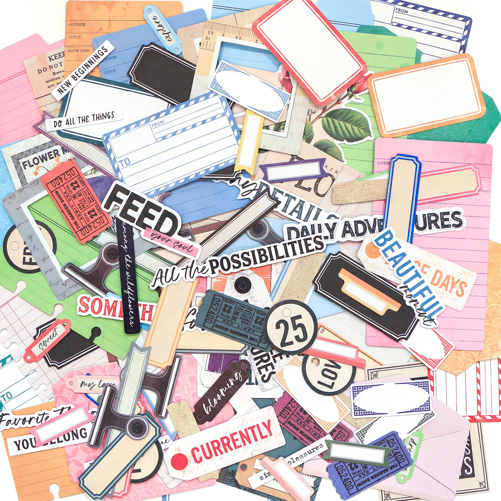 Unlock Your Creative Vision with Vicki Boutin’s Journaling Ephemera Bits! Dive into a world of creative possibilities with this 112-piece assortment. This pack is loaded with a diverse range of elements, including labels, file tabs, tags, journaling mats, and clips, all designed to enhance your journaling, scrapbooking, and mixed media projects. Create personalized layouts, add meaningful accents, and bring your stories to life with this versatile ephemera pack.