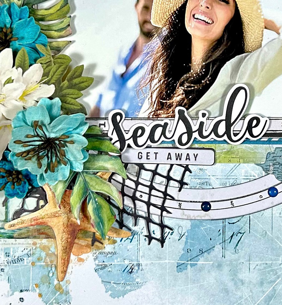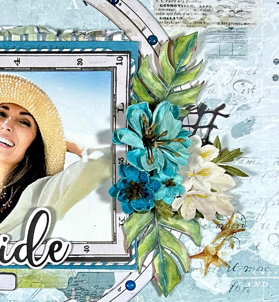 On the right of the photo, I mimicked the flowers on the left to create symmetry and balance. Here, also, you can see the torn paper behind the photo. This is from the Everywhere Spiral Notebook Set. I love the look of torn notebook paper. A couple starfish from the 12×12 Sunburst Classic Rub-On Transfer Set under the flowers and this side is done.