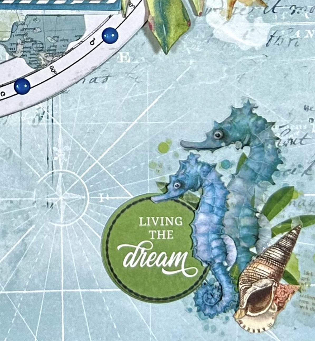 Don’t you just LOVE these Seahorses?? Sooo cute! The larger one is a rub-on from the 12×12 Sunburst Classic Rub-On transfer Set and the smaller one, along with the seashell, is from the Sunburst General Laser Cuts. The sentiment is also from the General Laser Cuts.