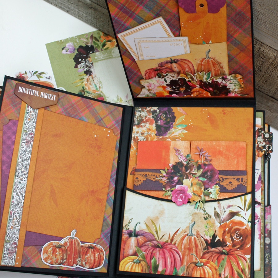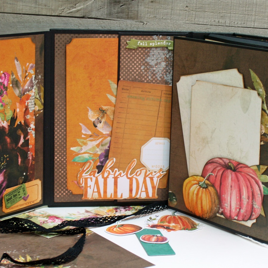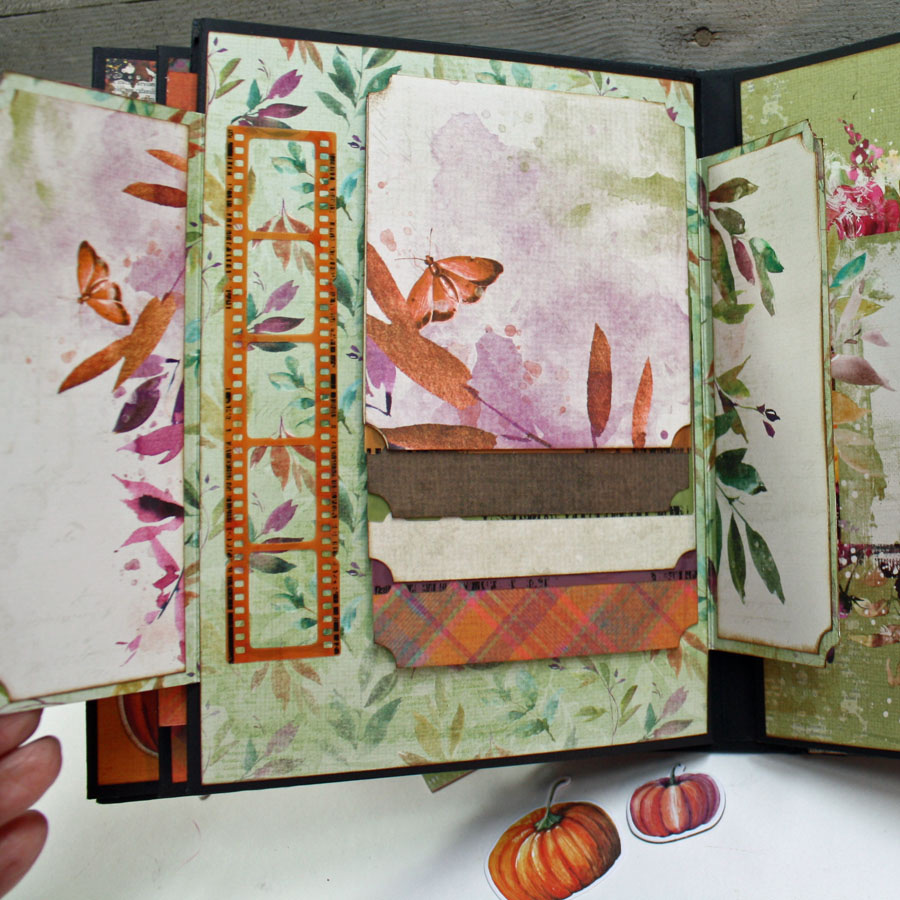 The flips and pockets are amazing and so easy to work with. They’re pre-scored! So just fold and decorate! The photo below shows one of the top flips with a fussy cut pumpkin tuck behind and a pocket that includes a shutter card closed with a belly band.