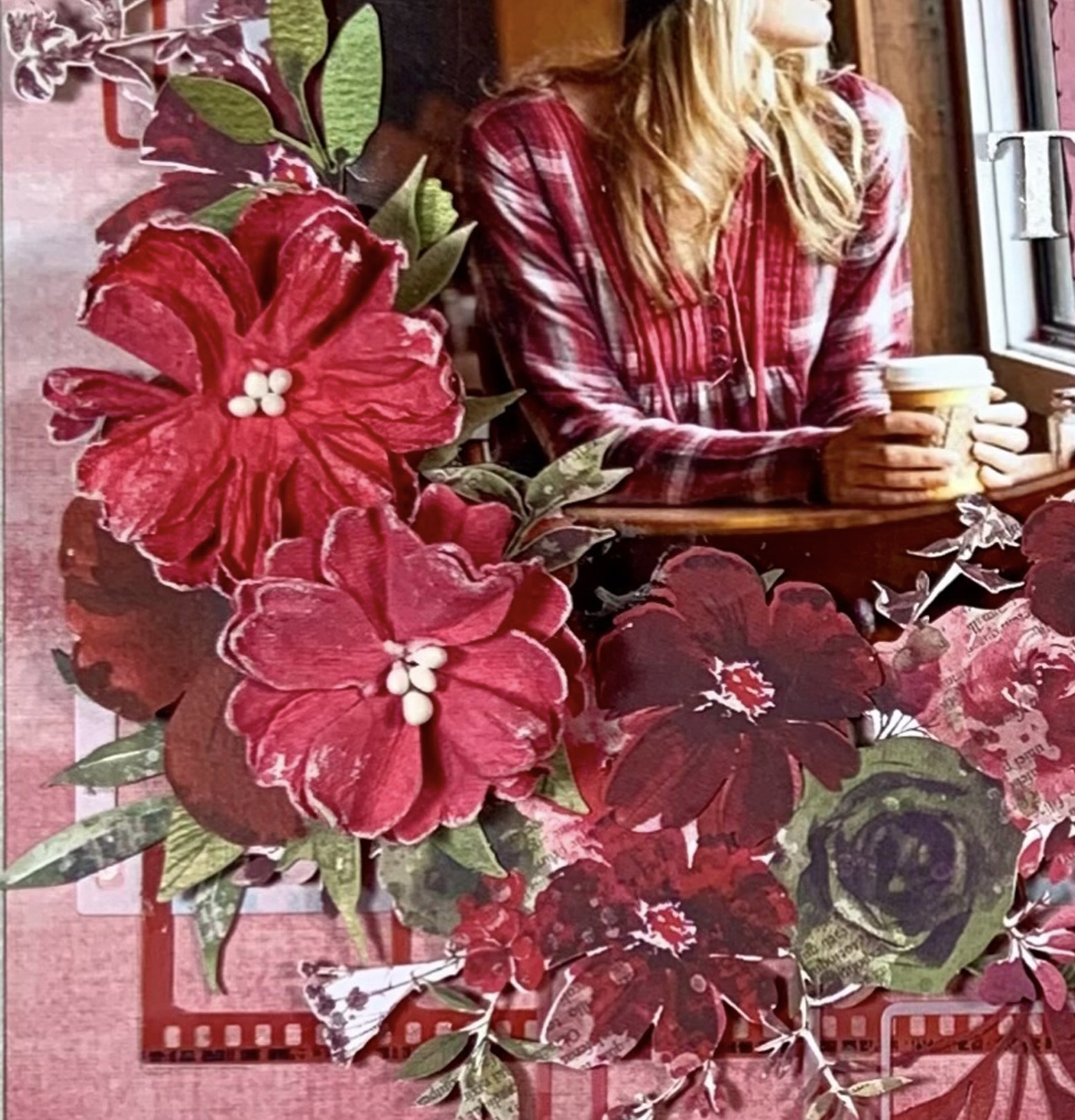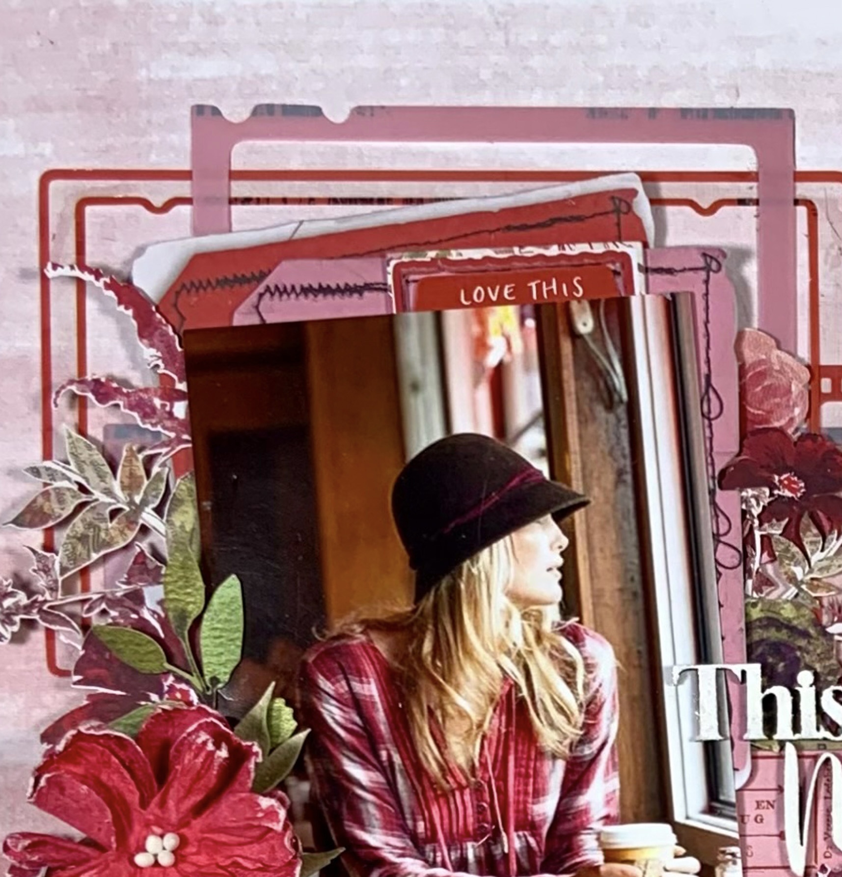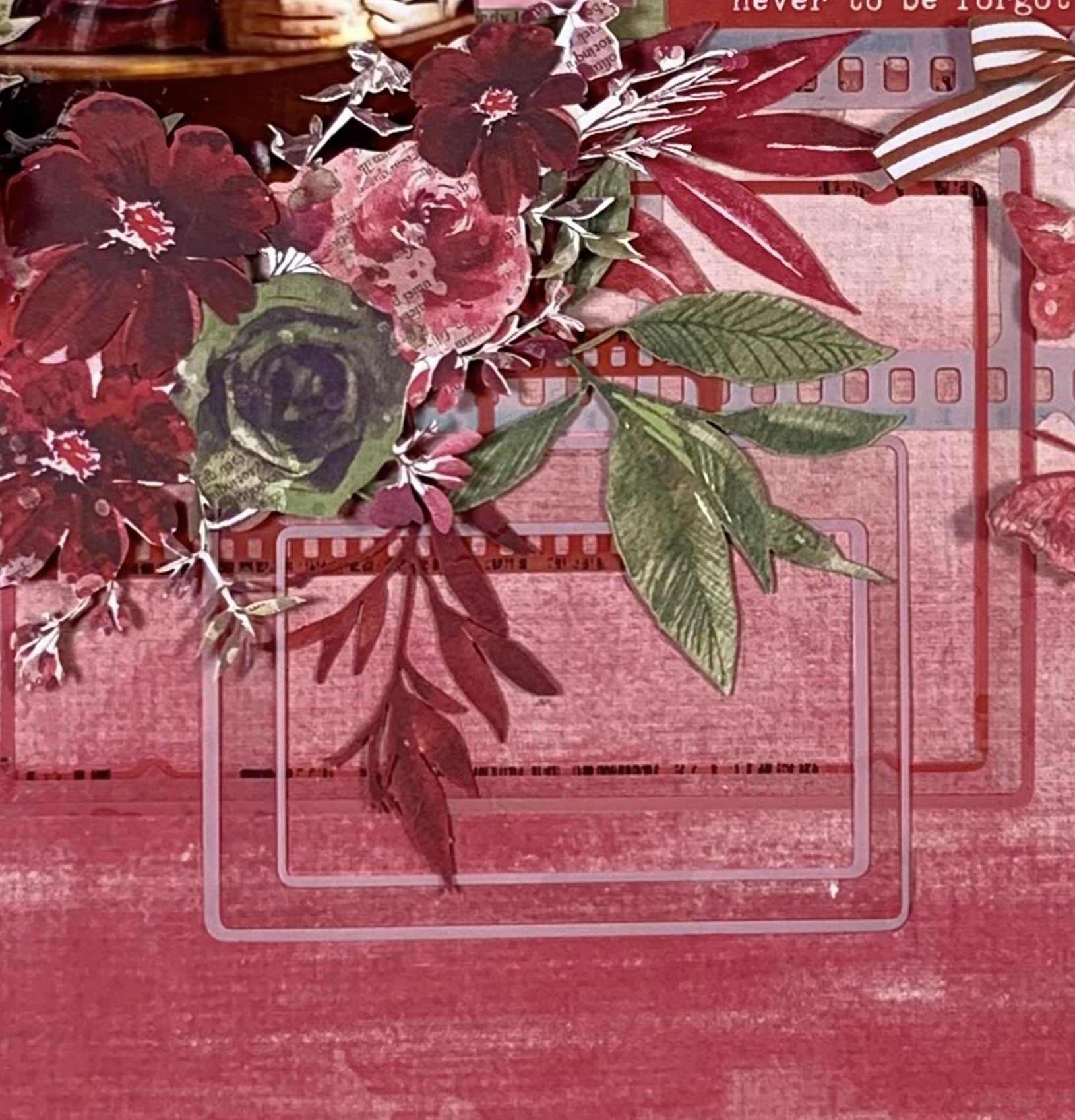 I used Rouge Colored Foundations 2 for the background paper. It was the perfect background to place all these filmstrips on. I used 9 filmstrips on this project. There are 30 assorted filmstrips and frames in the Filmstrips Frames package, more than enough with plenty left for other projects. I first figured out where I wanted the filmstrips to be, then glued them all down before I started the composition.This seemed to be the easiest way to do this, keeping them in place and not squiggling around everywhere while I figured where I wanted all the embellies to go!! After the background was finished I placed pieces from the Rouge Ephemera Bits to frame the photo with a little word strip to accent that area. I tilted the photo slightly so it stood out better since the colors in the photo and the composition are so similar Then I used a few of the Rouge Laser Cut Wildflowers tucked in under the left of the photo.