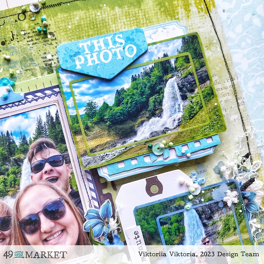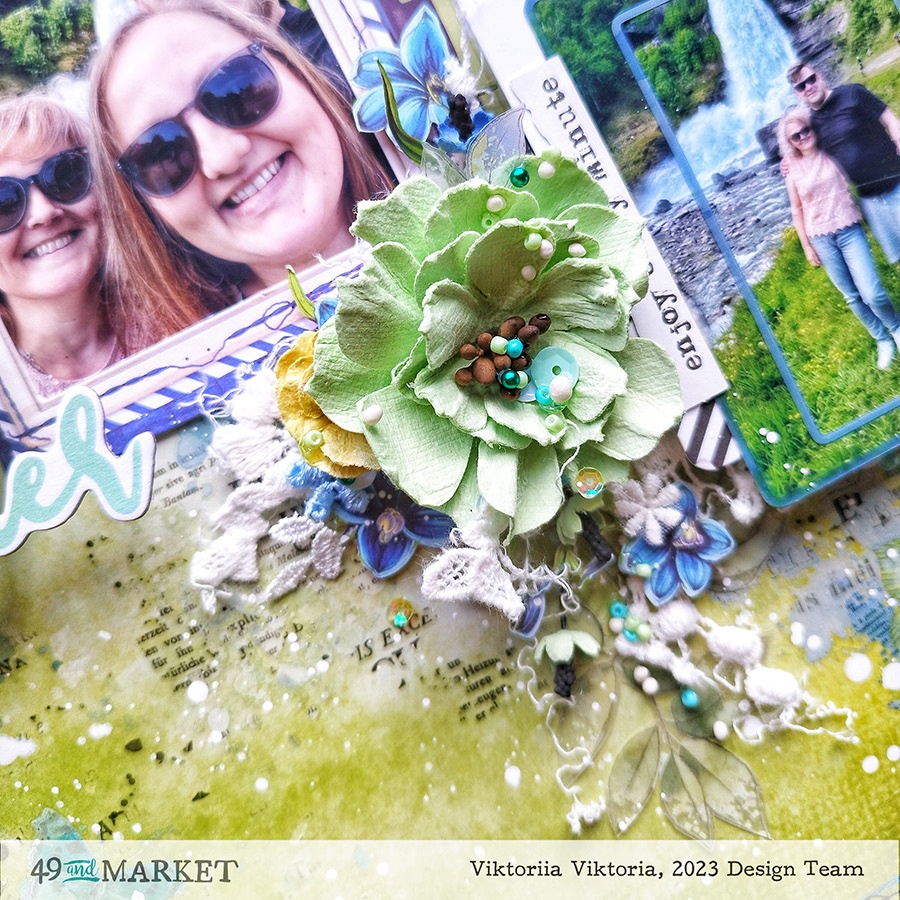 For the base of the layout, I chose a sheet from Vintage Artistry Everywhere 12×12 Colored foundations pack. I was thinking why not to choose a green sheet of paper and make a layout in the colors of my photos. So I decided to use as close colors as possible and keep the layout fresh.