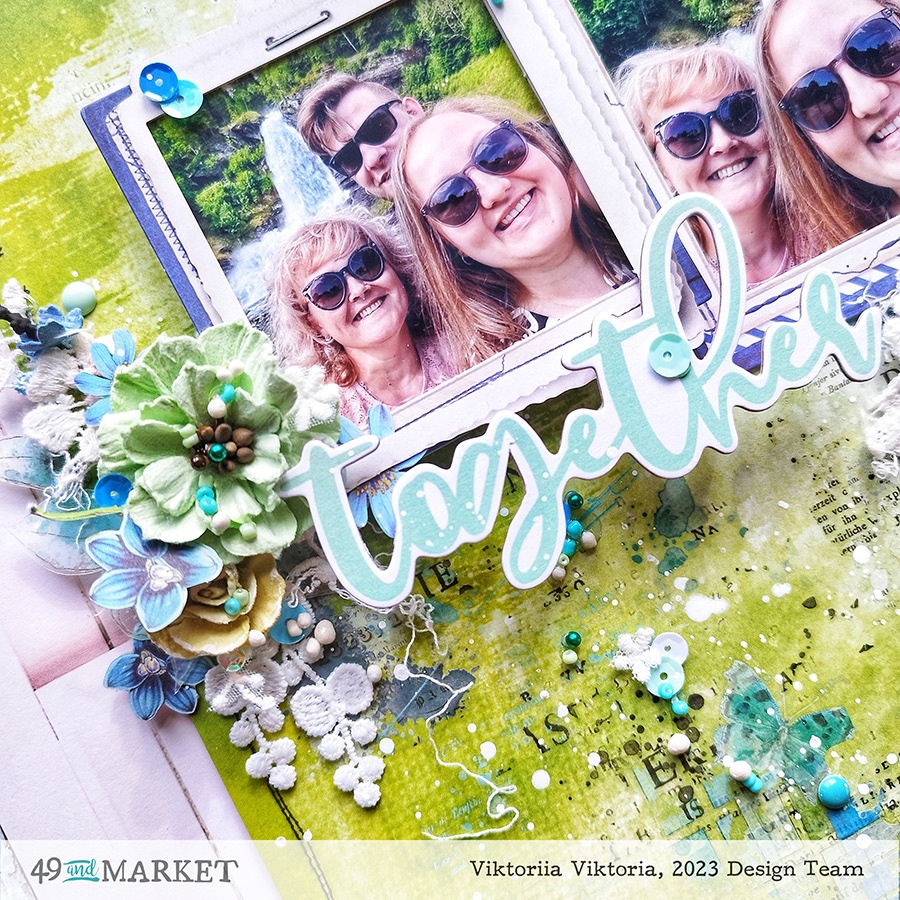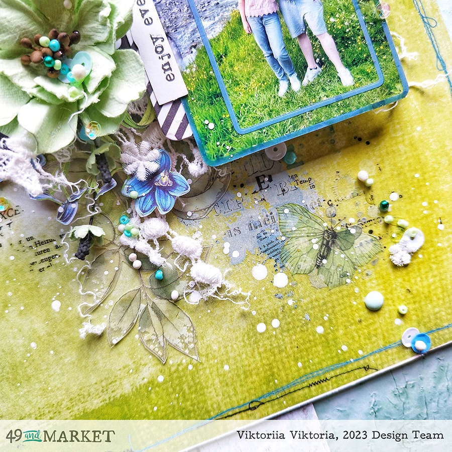 I didn’t want to add too many elements to the layout, but still I decided to diversify the background by adding different rubs from Spectrum Gardenia 12×12 rub-on transfer sheet, Essential Textblends rub-on transfers Mariner, and Lagoon. I also added some botanical elements from Spectrum Gardenia 6×8 botanical rub-on transfer set.